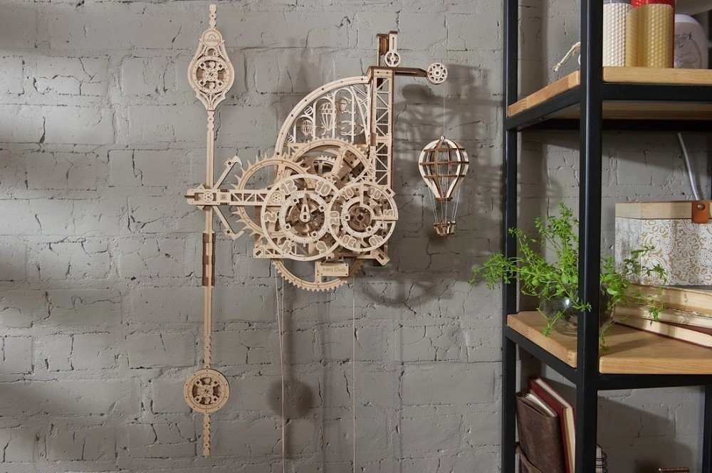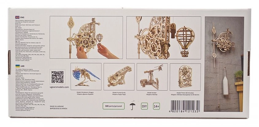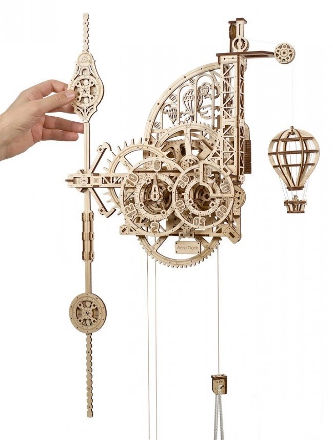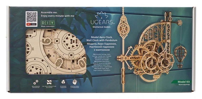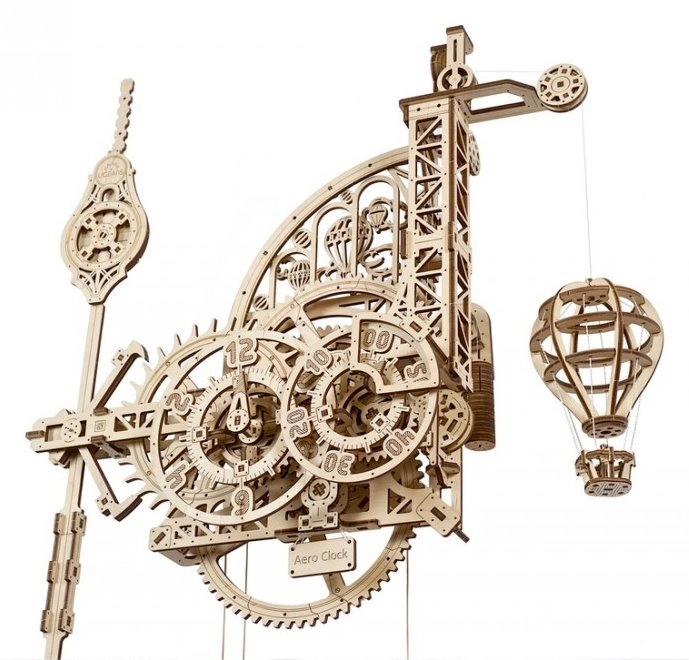 Το Ugears Aero είναι ένα επιτοίχιο μηχανικό ρολόι από ποιοτική κόντρα πλακέ, που συναρμολογείτε μόνοι σας χωρίς κόλλα. Η συναρπαστική θέα στον αποκαλυμμένο μηχανισμό ρολογιού με εκκρεμές και αντίβαρο προσφέρει μια μοναδική εμπειρία ακριβούς μηχανικής. Τον χρόνο τον διαβάζετε από ζεύγος καντράν που περιστρέφονται αντίθετα από τη φορά των δεικτών, ενώ το διακοσμητικό μοντέλο αερόστατου ανυψώνεται τακτικά και σε κάθε ακέραιη ώρα υπενθυμίζει με πτώση.