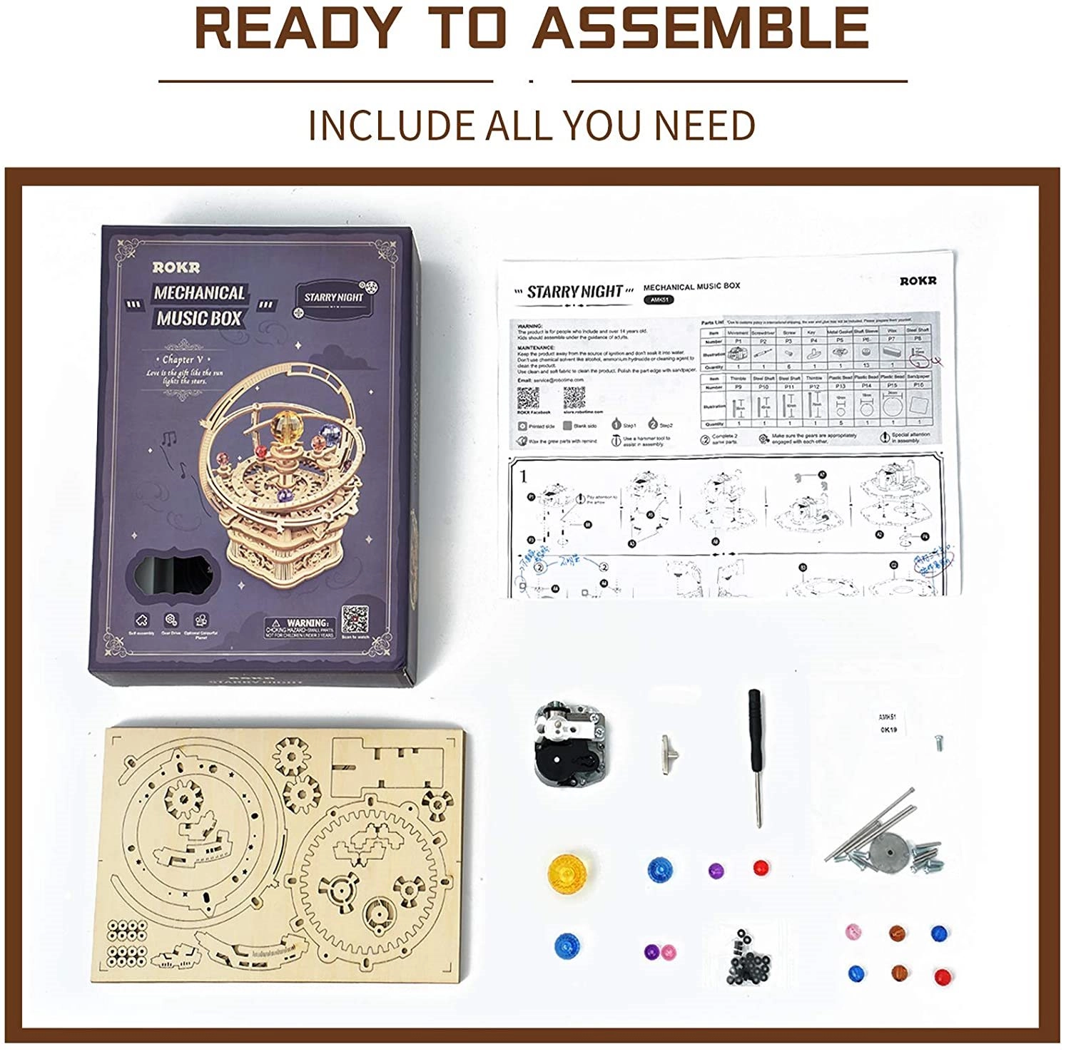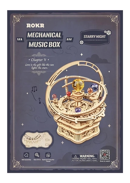 Η Έναστρη νύχτα αποτελεί φόρο τιμής στα ιστορικά μοντέλα orrery. Με το κούρδισμα, χάρη στο έξυπνο σύστημα γραναζιών και τον μεσημβρινό δακτύλιο, οι πλανήτες περιστρέφονται κομψά δημιουργώντας ομαλή, χαλαρωτική κίνηση. Τα επιμέρους κομμάτια από κόντρα πλακέ φλαμουριάς 2 mm είναι ακριβώς κομμένα με λέιζερ και αποσπώνται εύκολα απευθείας από τα φύλλα.