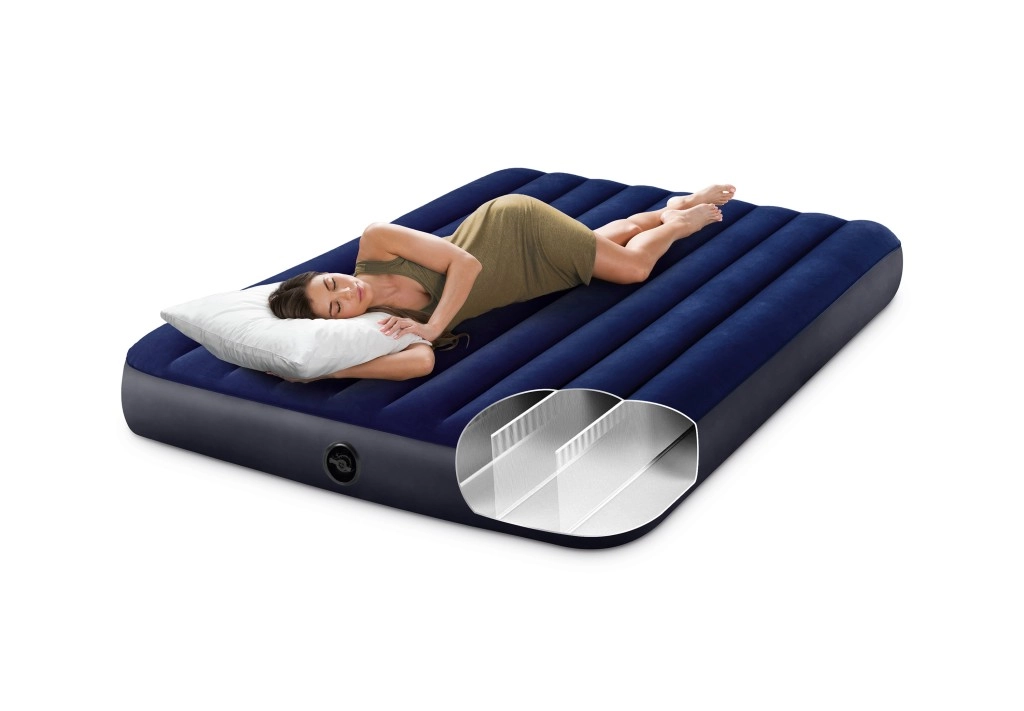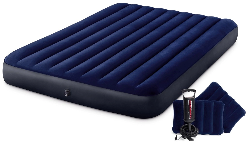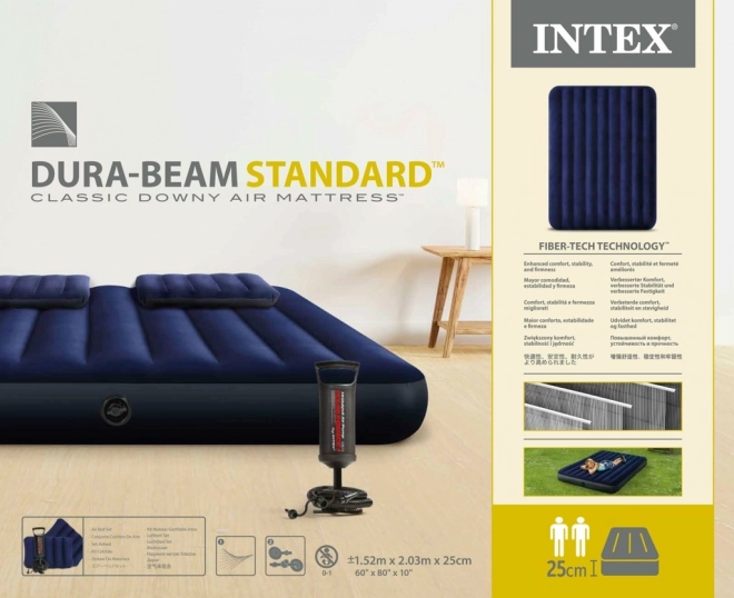 Πρακτικό φουσκωτό στρώμα INTEX για δύο άτομα με διαστάσεις 203 × 152 × 25 cm, μαλακή βελούδινη επιφάνεια και σταθερή κατασκευή για άνετο ύπνο στο σπίτι ή σε ταξίδια. Στη συσκευασία θα βρείτε χειροκίνητη αντλία εμβόλου, 2 φουσκωτά μαξιλάρια και μπάλωμα επισκευής. Χάρη στη βαλβίδα Boston το φούσκωμα και το ξεφούσκωμα είναι γρήγορα και εύκολα.