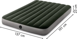 Το φουσκωτό στρώμα Intex με διαστάσεις 191x137x25 cm είναι ιδανικό για δύο άτομα. Είναι κατασκευασμένο από ανθεκτικό υλικό PVC, ενώ το επάνω μέρος του είναι καλυμμένο με αδιάβροχο βελούδινο ύφασμα ευχάριστο στην αφή.