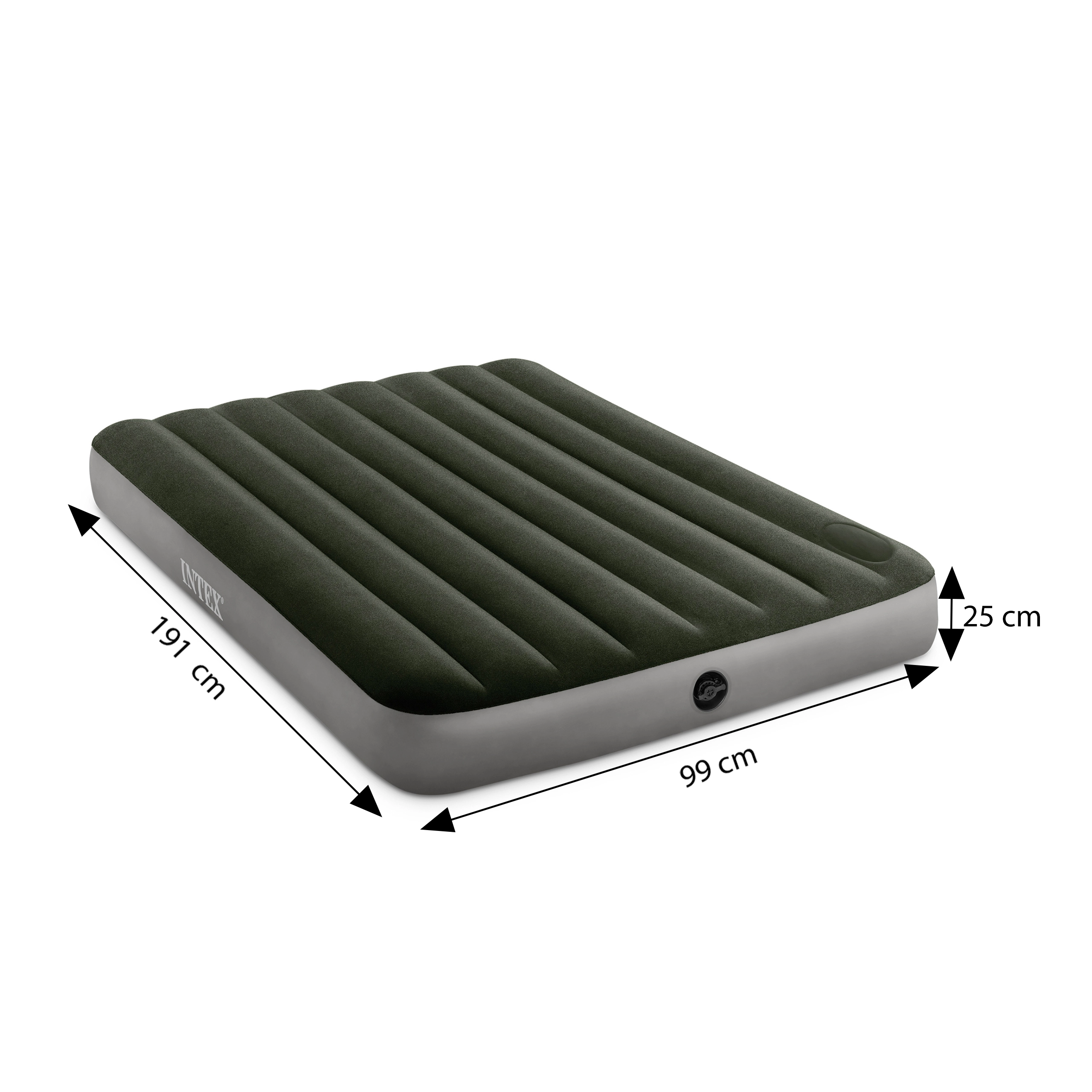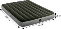 Πρακτικό φουσκωτό κρεβάτι INTEX για ένα άτομο με διαστάσεις 191 × 99 × 25 cm, ευχάριστη βελούδινη επιφάνεια και ενσωματωμένη αντλία ποδιού για εύκολο φούσκωμα οπουδήποτε. Χάρη στην τεχνολογία Dura-Beam Fiber το στρώμα είναι σταθερό, ανθεκτικό και προσφέρει υγιή στήριξη της σπονδυλικής στήλης. Ιδανικό για το σπίτι και για ταξίδια.