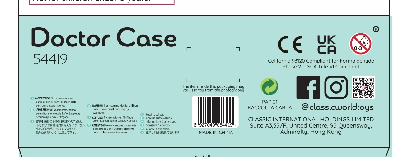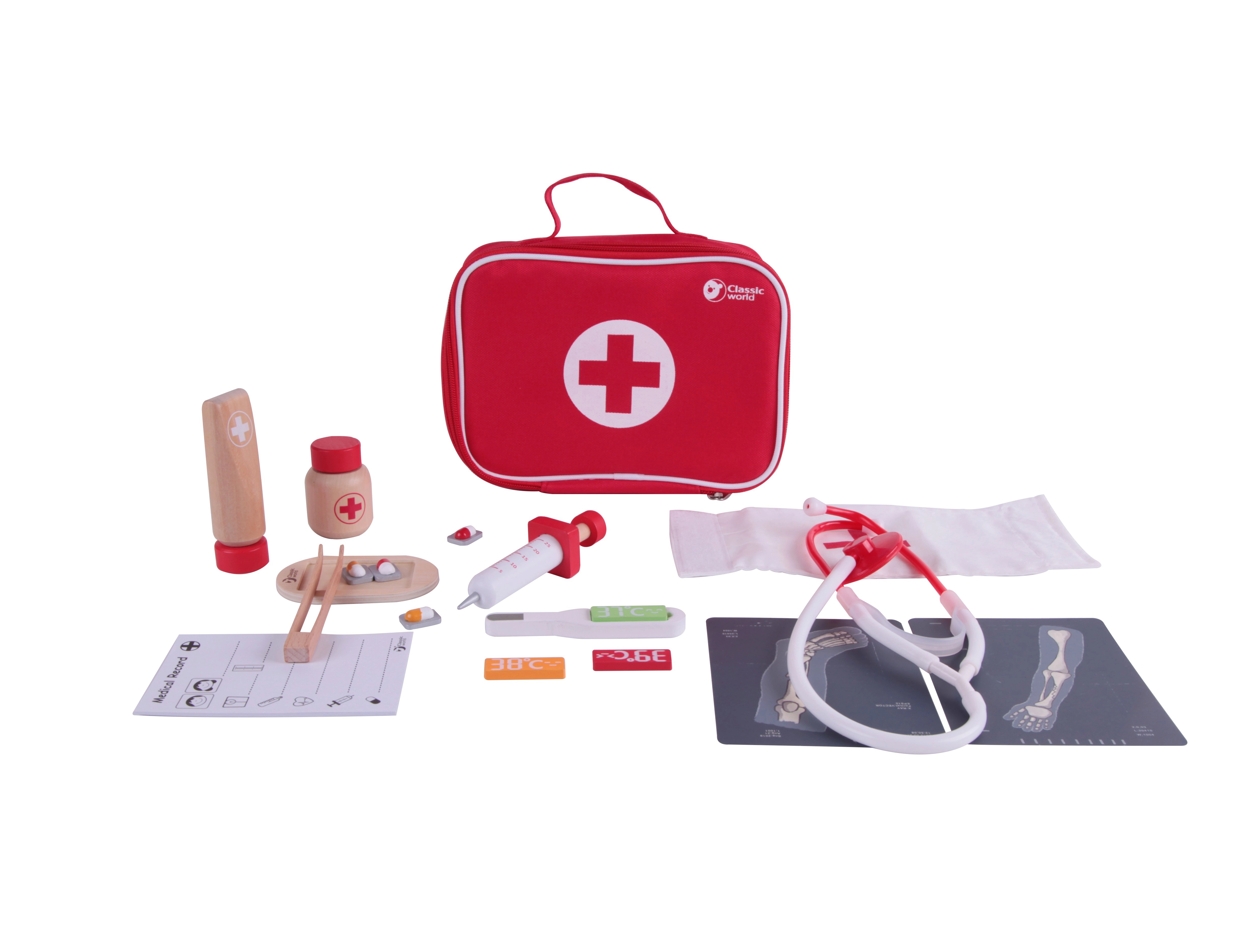 Το σετ της Classic World περιλαμβάνει ό,τι χρειάζεται ένας μικρός γιατρός για παιχνίδι ρόλων. Τα παιδιά μπορούν να ακούν τους καρδιακούς παλμούς των «ασθενών» τους (λούτρινα αρκουδάκια, κούκλες) με το στηθοσκόπιο, να «μετρούν» τη θερμοκρασία με το θερμόμετρο, να «κάνουν» ενέσεις ή να δίνουν τα απαραίτητα «φάρμακα». Το παιχνίδι γιατρού δεν είναι μόνο ένα αγαπημένο παιχνίδι ρόλων, αλλά και μάθημα ενσυναίσθησης και συμπόνιας, σημαντικό για τις κοινωνικές σχέσεις. Αυτό το σετ ενισχύει τη φαντασία και διδάσκει την επίλυση προβλημάτων.