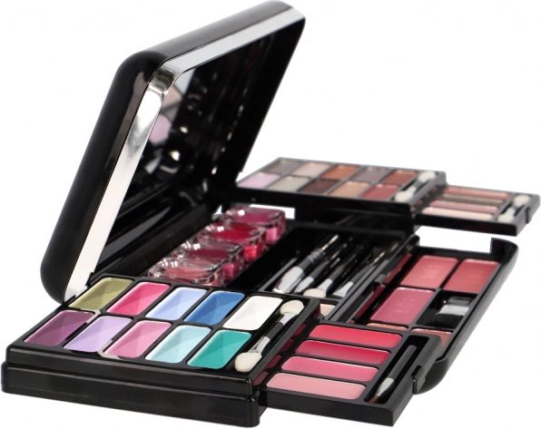 Η κομψή μαύρη κασετίνα με καθρεφτάκι κρύβει ένα πλήρες σετ για μακιγιάζ ματιών, προσώπου και χειλιών – ιδανικό για ταξίδια και καθημερινή χρήση.