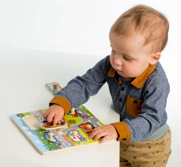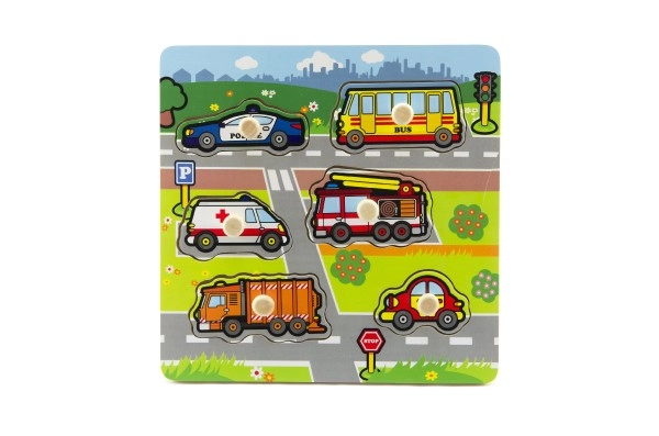 Κάθε μία από τις έξι ενθέσεις απεικονίζει διαφορετικό μέσο μεταφοράς: περιπολικό, λεωφορείο, ασθενοφόρο, πυροσβεστικό όχημα, απορριμματοφόρο και επιβατικό αυτοκίνητο. Η συναρμολόγηση είναι εύκολη χάρη στη ξύλινη βάση και τα χερούλια, που διευκολύνουν τους μικρούς χρήστες στον χειρισμό των κομματιών.
