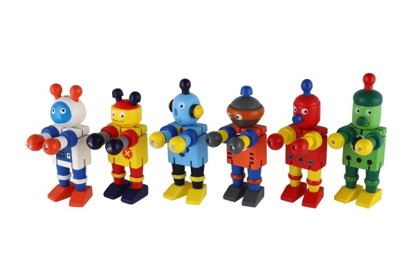 Αυτά τα πολύχρωμα ξύλινα ρομπότ είναι ιδανικά για τα πρώτα οικοδομικά και παιχνιδιάρικα σενάρια ρόλων. Χάρη στους ελαστικούς συνδέσμους, λυγίζουν εύκολα, κρατούν πόζες και ενθαρρύνουν τα παιδιά να δημιουργούν τις δικές τους ιστορίες. Το ανθεκτικό ξύλο και οι λείες άκρες εξασφαλίζουν ασφαλή και ευχάριστη χρήση ακόμη και για τους μικρότερους.