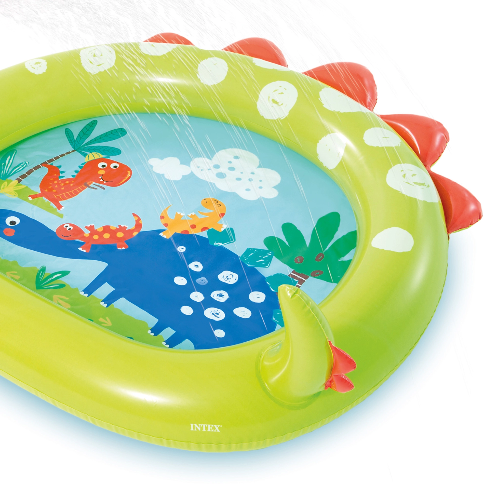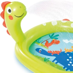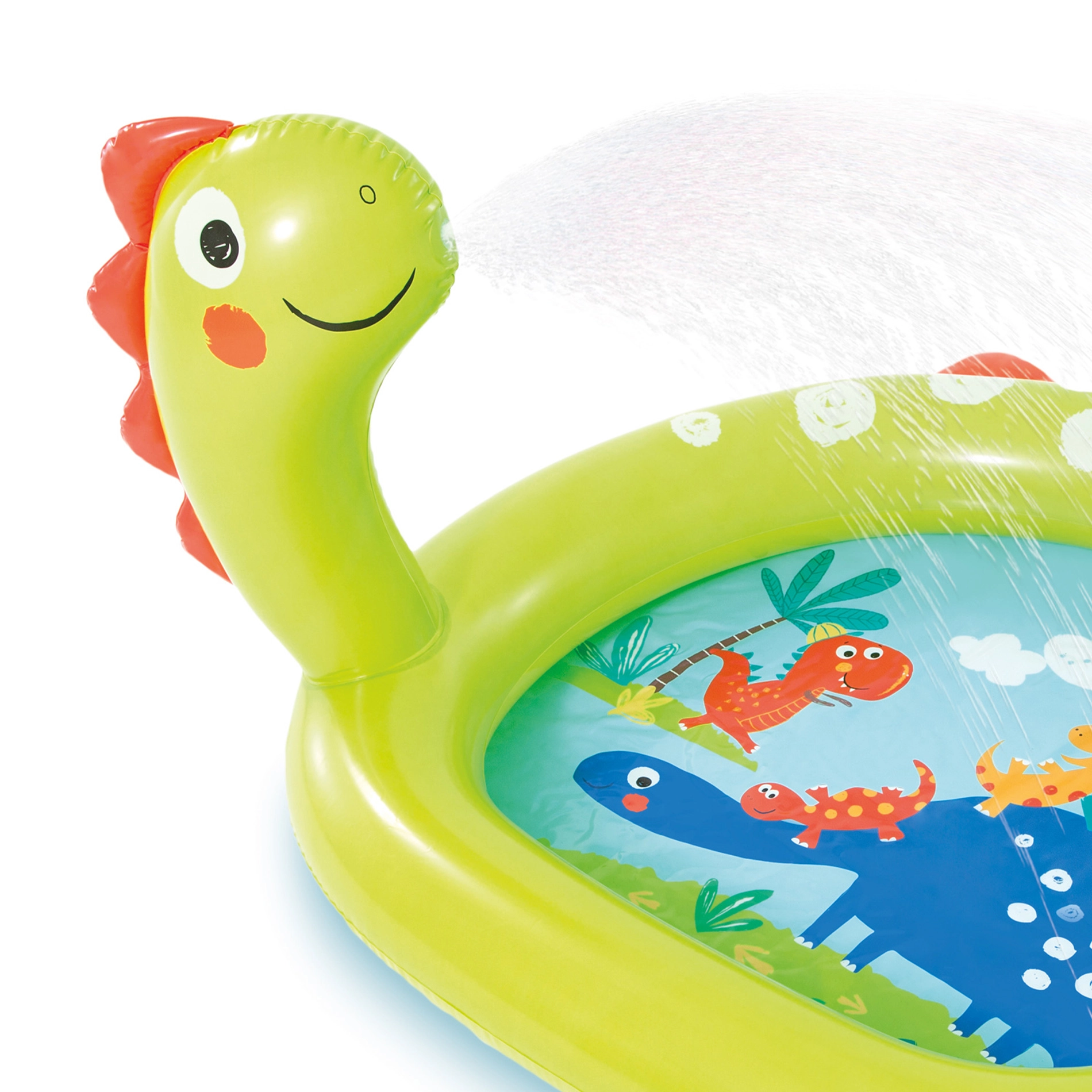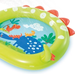 Χαρούμενη φουσκωτή πισίνα με σιντριβάνι και θέμα δεινόσαυρου, ιδανική για καλοκαιρινή διασκέδαση στον κήπο. Η πισίνα είναι κατασκευασμένη από ποιοτικό υλικό PVC με διαστάσεις 119 x 109 x 66 cm.
