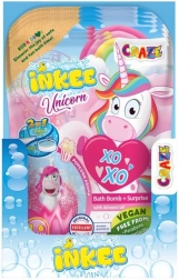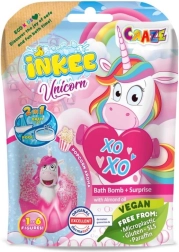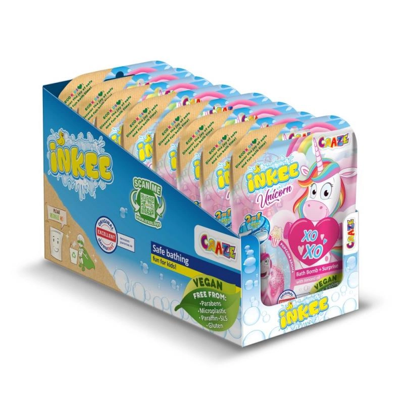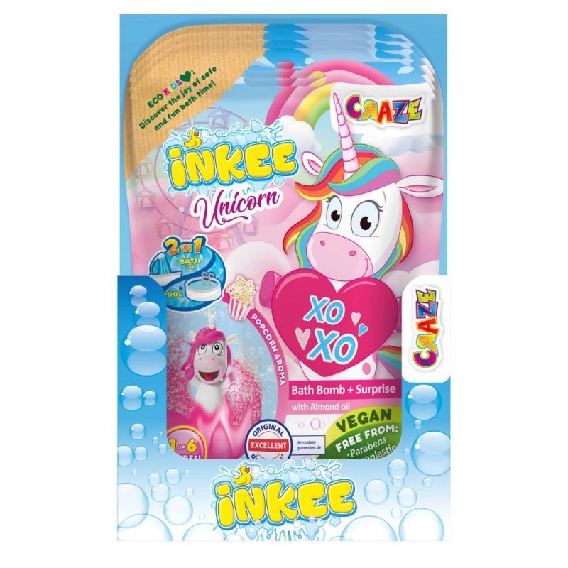 Μετατρέψτε το μπάνιο σε χαρούμενο παιχνίδι. Η αφρώδης βόμβα INKEE χρωματίζει το νερό, ευωδιάζει ευχάριστα γλυκό ποπκόρν και μετά το διάλυμα αποκαλύπτει μια μικρή φιγούρα μονόκερου. Ιδανικό ως μικρό δώρο, επιβράβευση ή διασκεδαστικό συμπλήρωμα στη ρουτίνα του παιδικού μπάνιου.