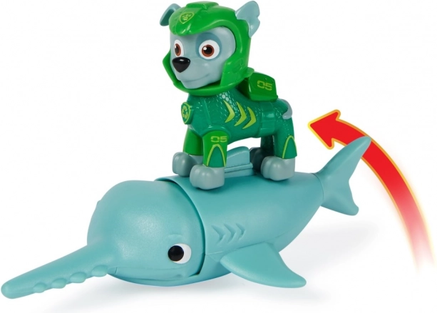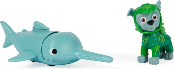 Το σετ περιλαμβάνει τον αγαπημένο σκυλάκο Rocky με πράσινο εξοπλισμό και τον θαλάσσιο σύμμαχο – καρχαρία-πριόνι με κινούμενο στόμα. Ο Rocky έχει κινούμενο κεφάλι, ώστε να δημιουργείτε εύκολα δυναμικές σκηνές από τις υποβρύχιες αποστολές Aqua Pups.