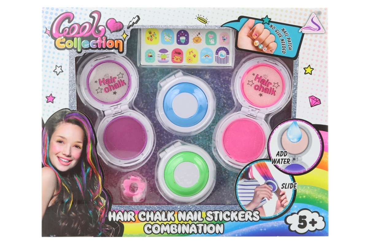 Σε μία συσκευασία αποκτάτε τέσσερα ζωηρά χρώματα για τα μαλλιά και ένα σετ χαριτωμένων αυτοκόλλητων νυχιών για ολοκληρωμένο party look.