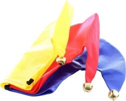 Πολύχρωμο καπέλο κλόουν σε κίτρινο, κόκκινο και μπλε με μεταλλικά κουδουνάκια για παιχνιδιάρικη αίσθηση σε κάθε κίνηση.
