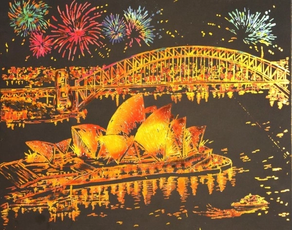 Ανακαλύψτε τη μαγεία της τεχνικής ξυσίματος: κάτω από τη μαύρη στρώση κρύβεται χρυσό υπόβαθρο, που χαρίζει σε κάθε χάραγμα έναν έντονο, κομψό αντίθετο εφέ. Το μοτίβο της εμβληματικής Όπερας του Σίδνεϊ σε νυχτερινή εκδοχή θα ενθουσιάσει αρχάριους και προχωρημένους, ενώ το τελικό έργο θα γίνει μια πρωτότυπη διακόσμηση.