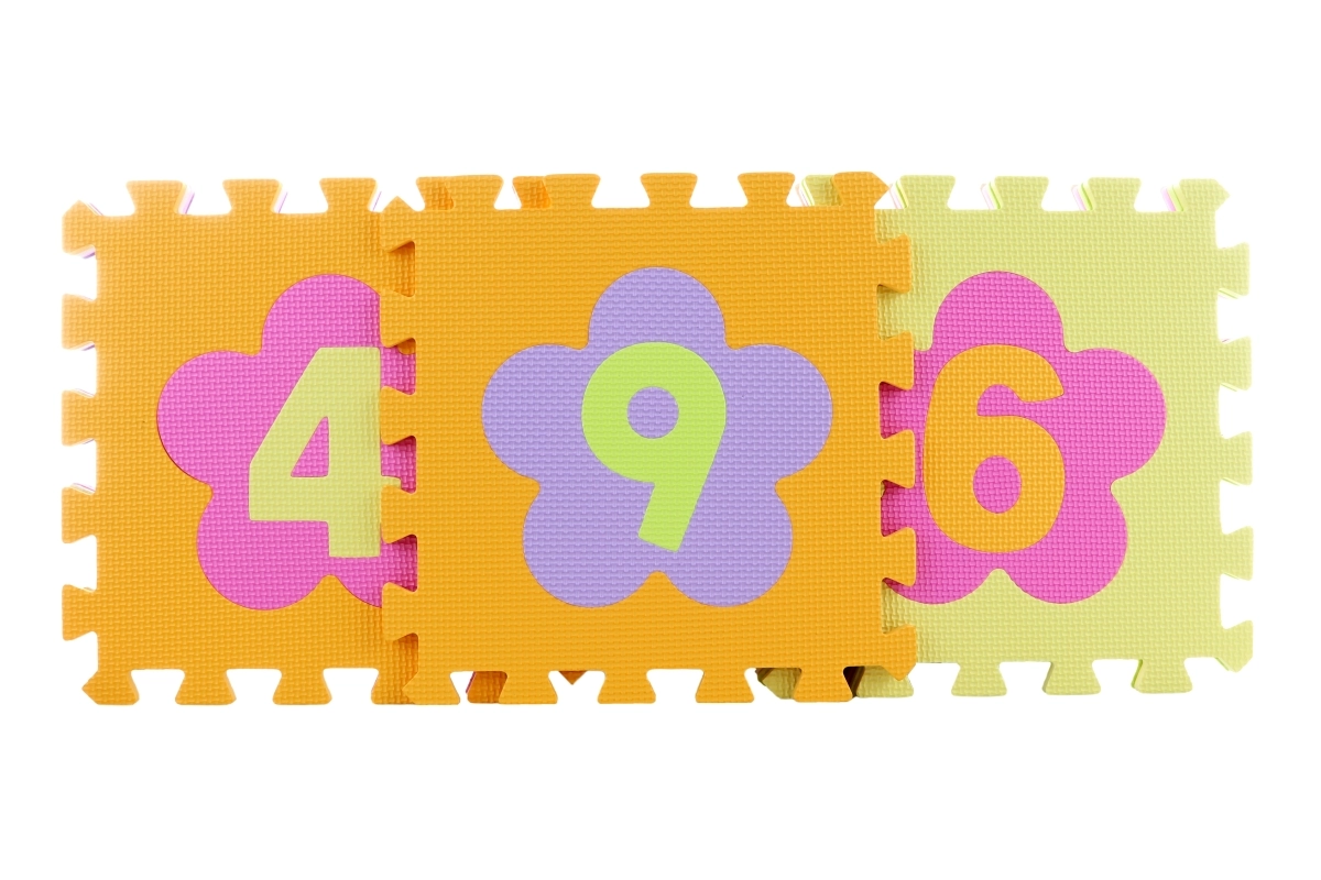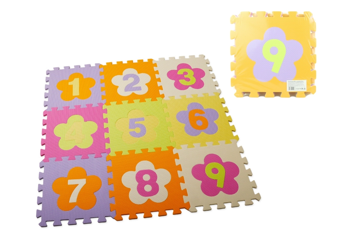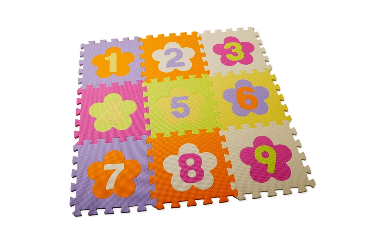 Πολύχρωμο αφρώδες παζλ με ψηφία και αποσπώμενα κομμάτια που δημιουργεί μια μαλακή και ασφαλή επιφάνεια παιχνιδιού για παιδιά από 3 ετών. Τα κομμάτια διαστάσεων 28 × 28 cm συνδέονται εύκολα, έχουν ραβδωτή αντιολισθητική επιφάνεια, είναι πλενόμενα, μειώνουν τον θόρυβο και μονώνουν από το κρύο. Η συσκευασία περιέχει 9 τετράγωνα κομμάτια.