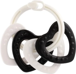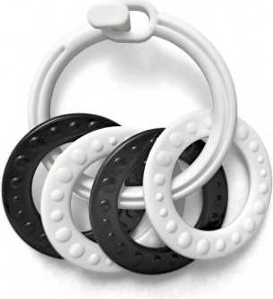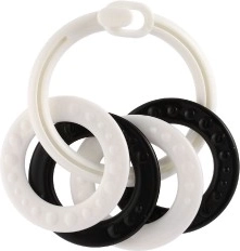 Αυτό το σετ κρίκων σε ασπρόμαυρη απόδοση είναι σχεδιασμένο για τα πιο μικρά μωρά. Τα χρώματα με υψηλή αντίθεση τραβούν την προσοχή, βοηθούν στην εξάσκηση της συγκέντρωσης και υποστηρίζουν την υγιή ανάπτυξη της όρασης. Χάρη στα διαφορετικά σχήματα και τις υφές, το παιδί εξασκεί τη λεπτή κινητικότητα και τον συντονισμό χεριού–ματιού.