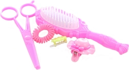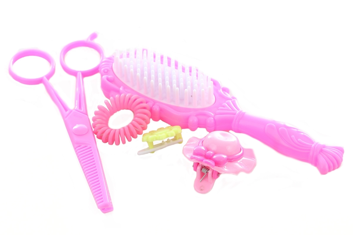 Περιλαμβάνονται χτενάκι, παιδικό ψαλιδάκι για παιχνίδι, σπιράλ, λαστιχάκια και τσιμπιδάκια – όλα προσαρμοσμένα σε παιδικό μέγεθος για ασφαλές και διασκεδαστικό παιχνίδι.