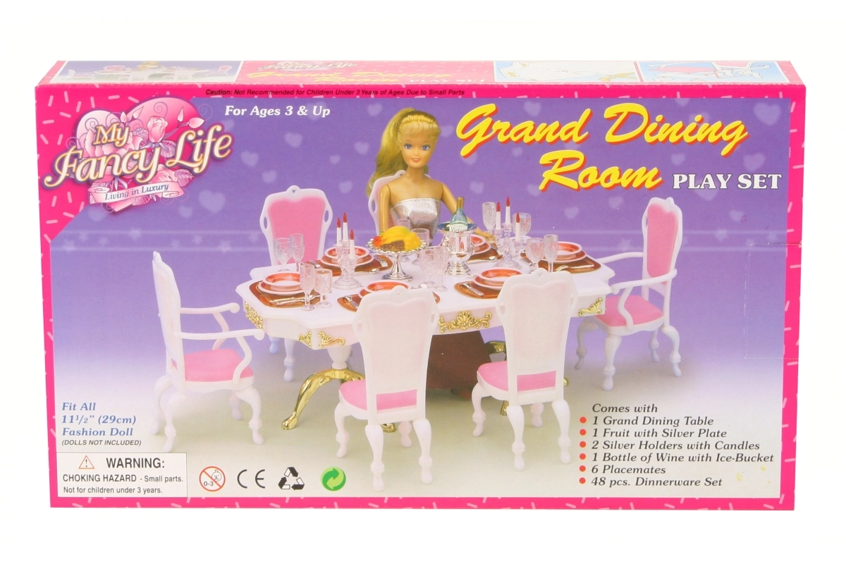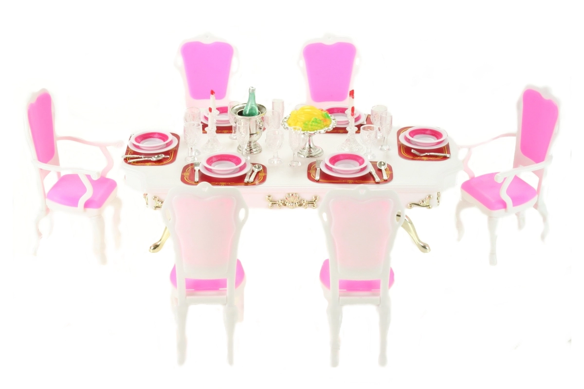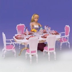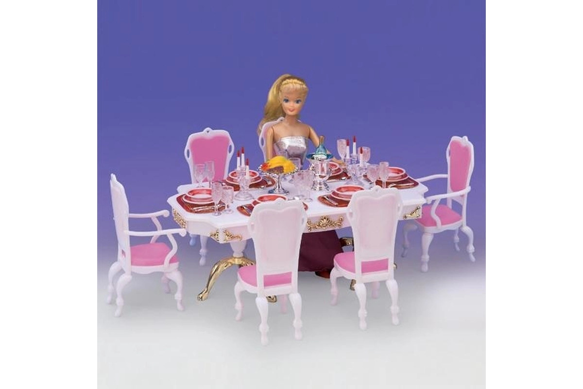 Το στιλάτο σετ Glorie για δείπνο κουκλών μετατρέπει κάθε δωματιάκι σε κομψή τραπεζαρία. Περιλαμβάνει μεγάλο πλαστικό τραπέζι, 6 καρέκλες (2 με μπράτσα) και πλούσιο στρώσιμο τραπεζιού με ποτήρια, πιάτα και μαχαιροπίρουνα. Ιδανικό για δημιουργικό παιχνίδι παιδιών από 3 ετών.