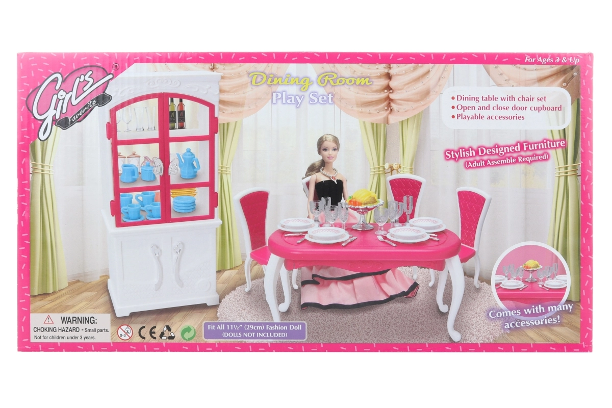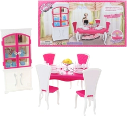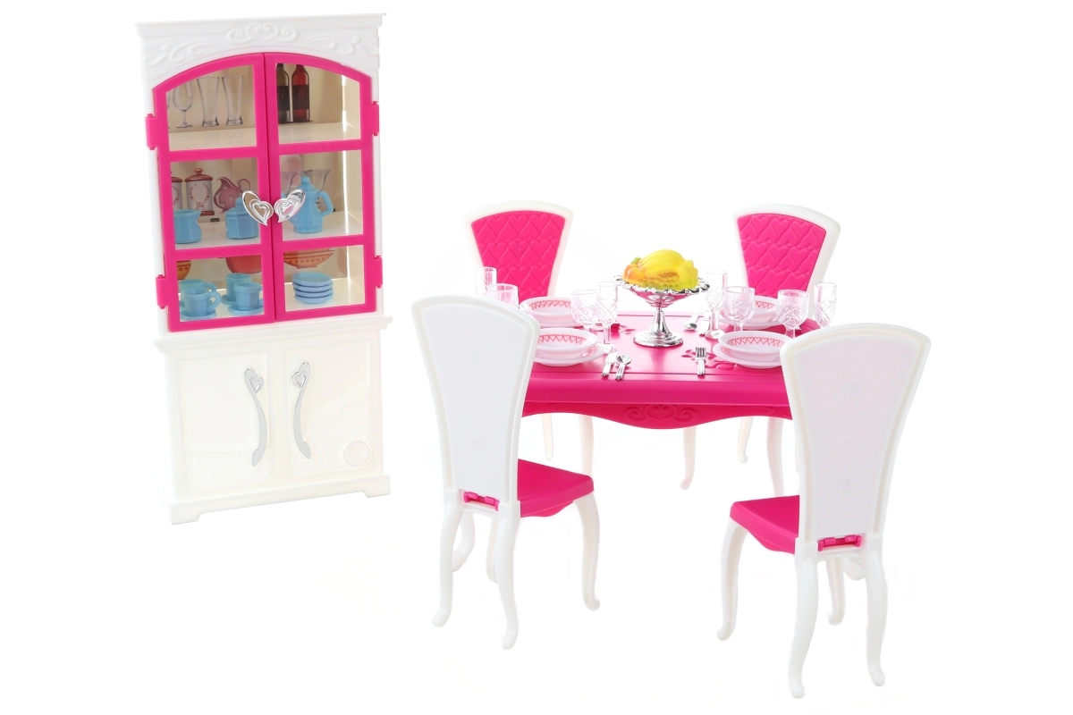 Το σετ τραπεζαρίας Glorie για κούκλες προσφέρει μια ολοκληρωμένη εμπειρία γεύματος με ένα κομψό πλαστικό τραπέζι, τέσσερις καρέκλες και ντουλάπι, συμπληρωμένο με πιάτα, ποτήρια, μαχαιροπίρουνα και διακοσμητικά αξεσουάρ.