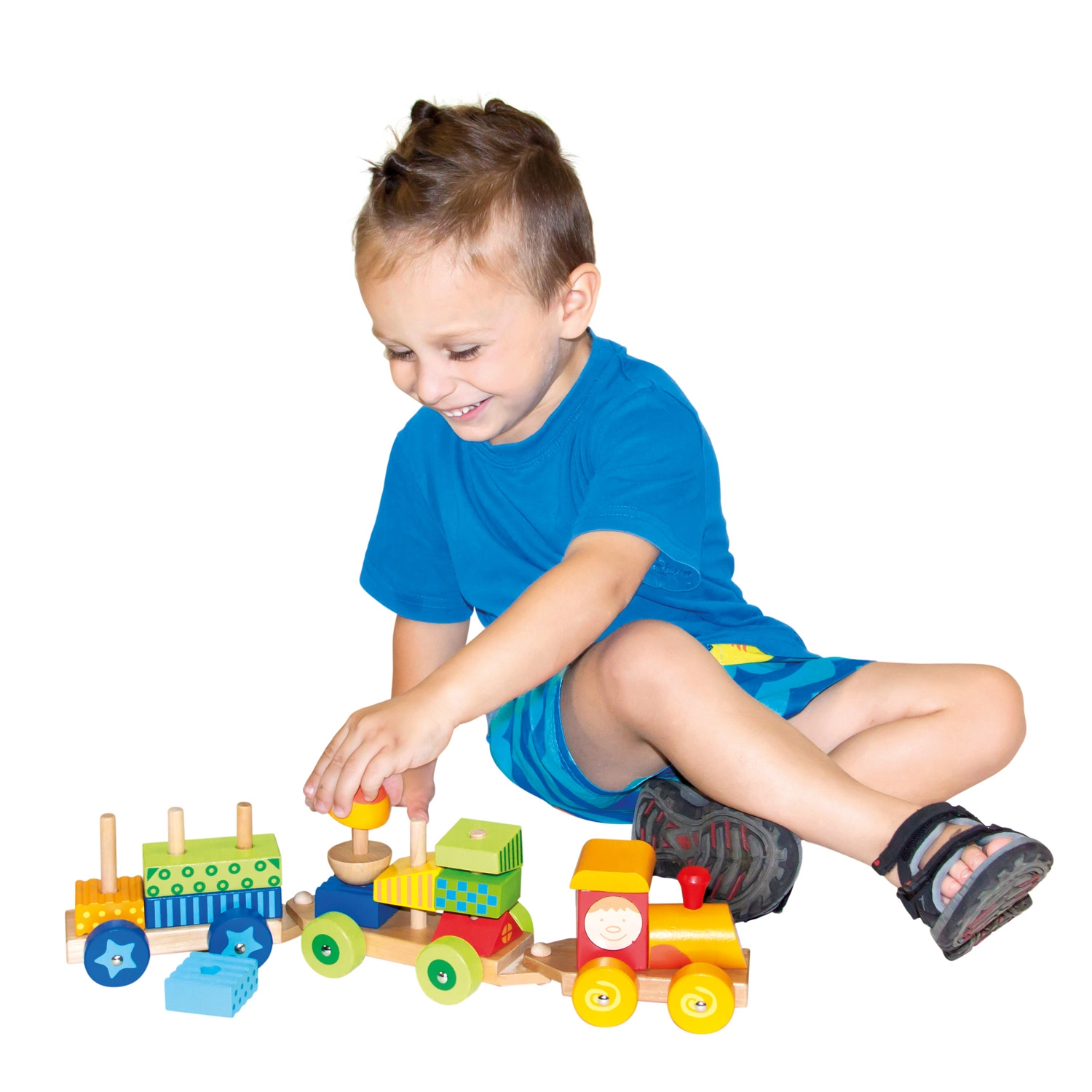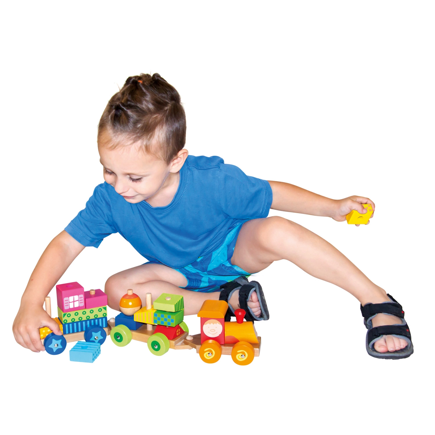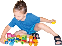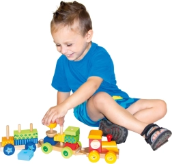 Το πολυχρηστικό ξύλινο τρενάκι δεν είναι μόνο συρόμενο παιχνίδι, αλλά και κατασκευαστικό σετ που επιτρέπει στα παιδιά να αναπτύξουν τη δημιουργικότητά τους. Το τρενάκι περιλαμβάνει τρεις βάσεις/σασί και 18 διαφορετικούς κύβους που μπορούν να συνδυαστούν όπως υπαγορεύει η φαντασία.