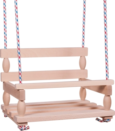 Καθολική ξύλινη κούνια από φυσικό ξύλο με φαρδιά έδρα 40 × 30 cm και μέγιστο φορτίο έως 80 kg. Ιδανική για κήπο και βεράντα, με σταθερή και ανθεκτική κατασκευή, εύκολη συναρμολόγηση και τσέχικη κατασκευή σε πρακτική σακούλα.