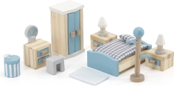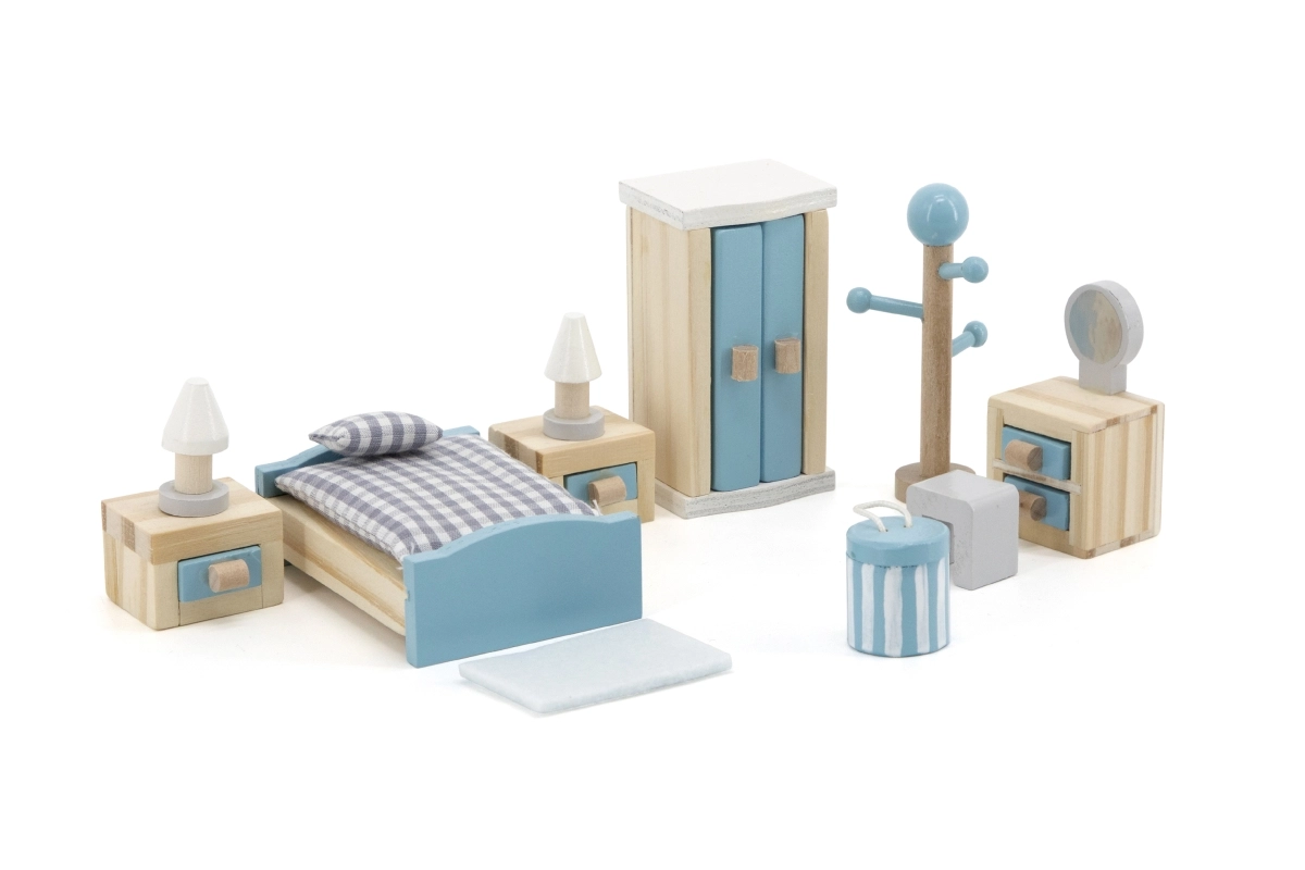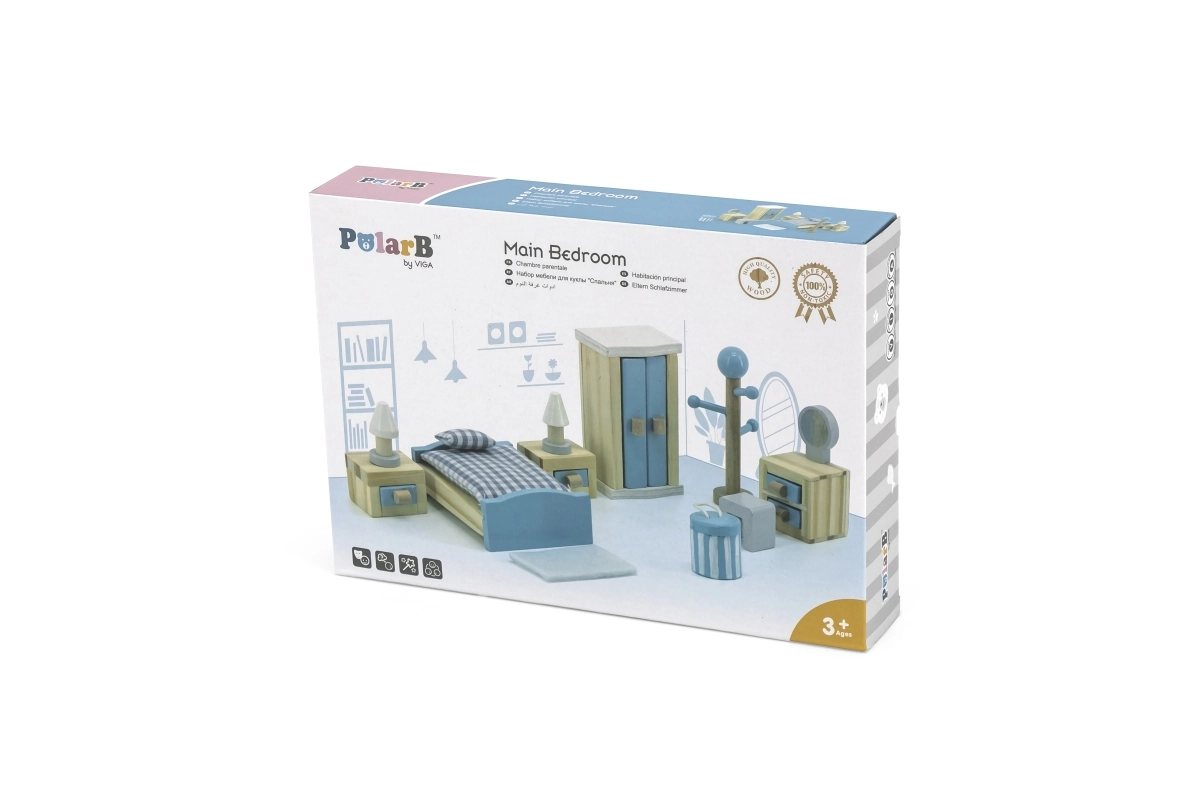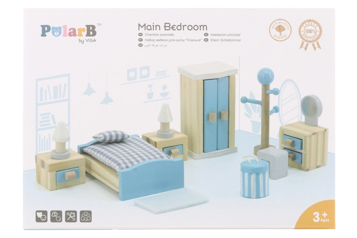 Η ξύλινη κρεβατοκάμαρα VIGA POLARB μετατρέπει κάθε κουκλόσπιτο σε ένα ζεστό μέρος για παιχνίδι. Το σετ περιλαμβάνει κρεβάτι, 2 κομοδίνα, ντουλάπα, κρεμάστρα, τουαλέτα με σκαμπό, χαλάκι και καλαθάκι – όλα σε απαλό μπλε και φυσικό χρώμα. Η ποιοτική κατασκευή, οι λείες άκρες και τα μη τοξικά χρώματα εξασφαλίζουν ασφαλές παιχνίδι, ενώ ο πλούσιος εξοπλισμός ενισχύει τη φαντασία, τη δημιουργικότητα και το role-play των παιδιών.