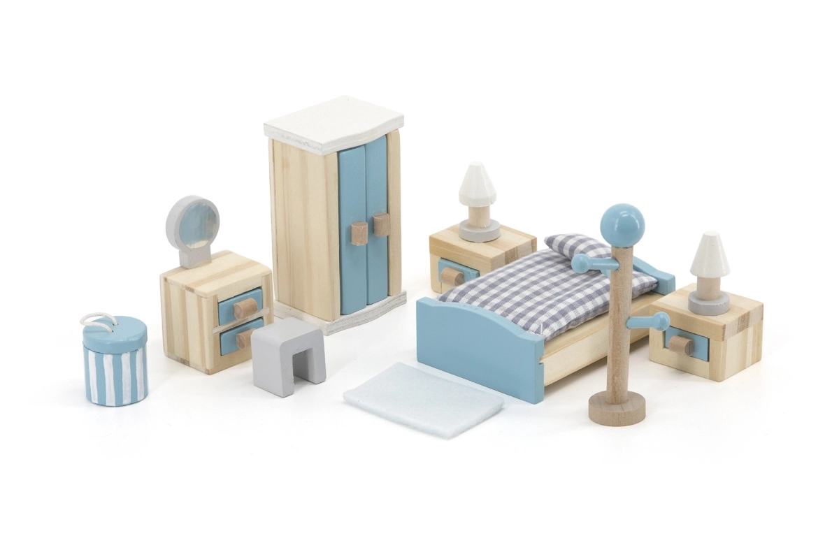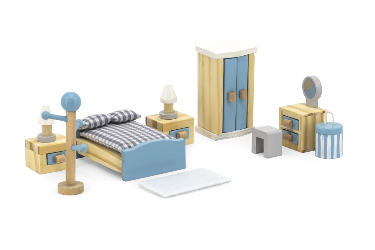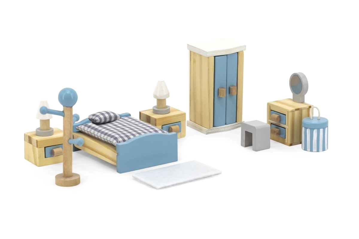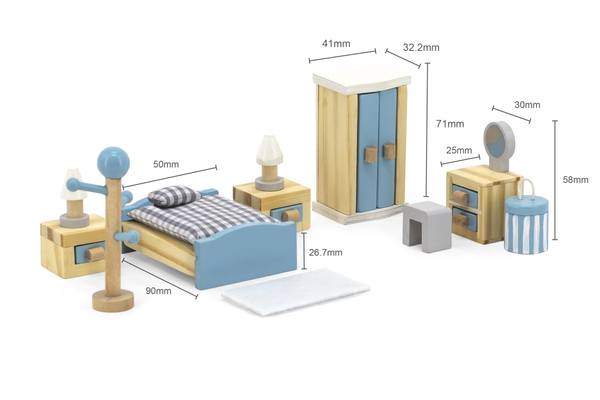 Κρεβάτι, 2 κομοδίνα, ντουλάπα, κρεμάστρα και τουαλέτα με σκαμπό ολοκληρώνουν κάθε μινιατούρα σπιτιού. Τα παιδιά μπορούν εύκολα να διακοσμήσουν τα έπιπλα και να δημιουργούν τις δικές τους ιστορίες.