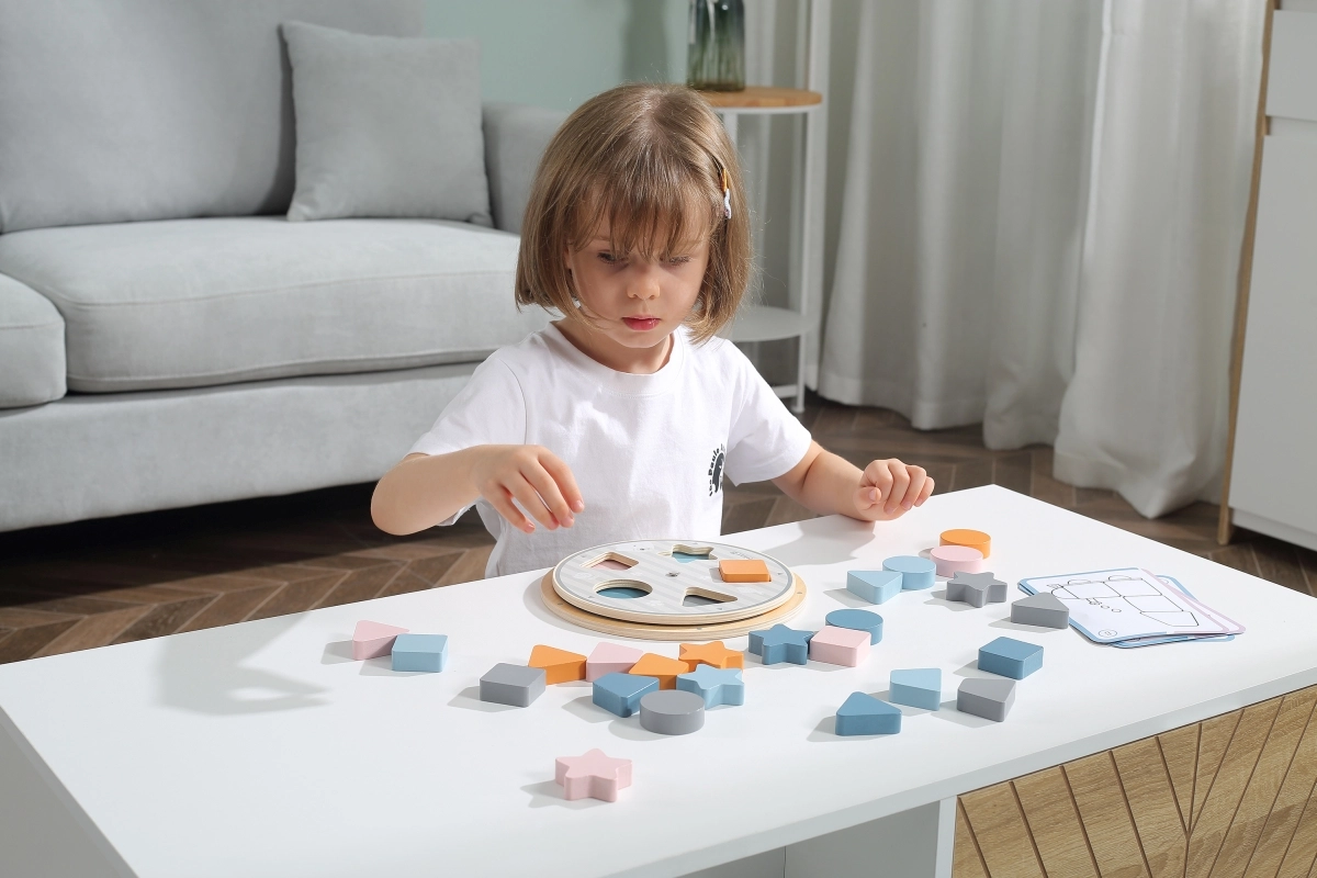 - περιστρεφόμενη βάση ταξινόμησης, σετ ξύλινων σχημάτων (διάφορα χρώματα και σχήματα), κάρτες προτύπων, υφασμάτινο πουγκί