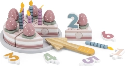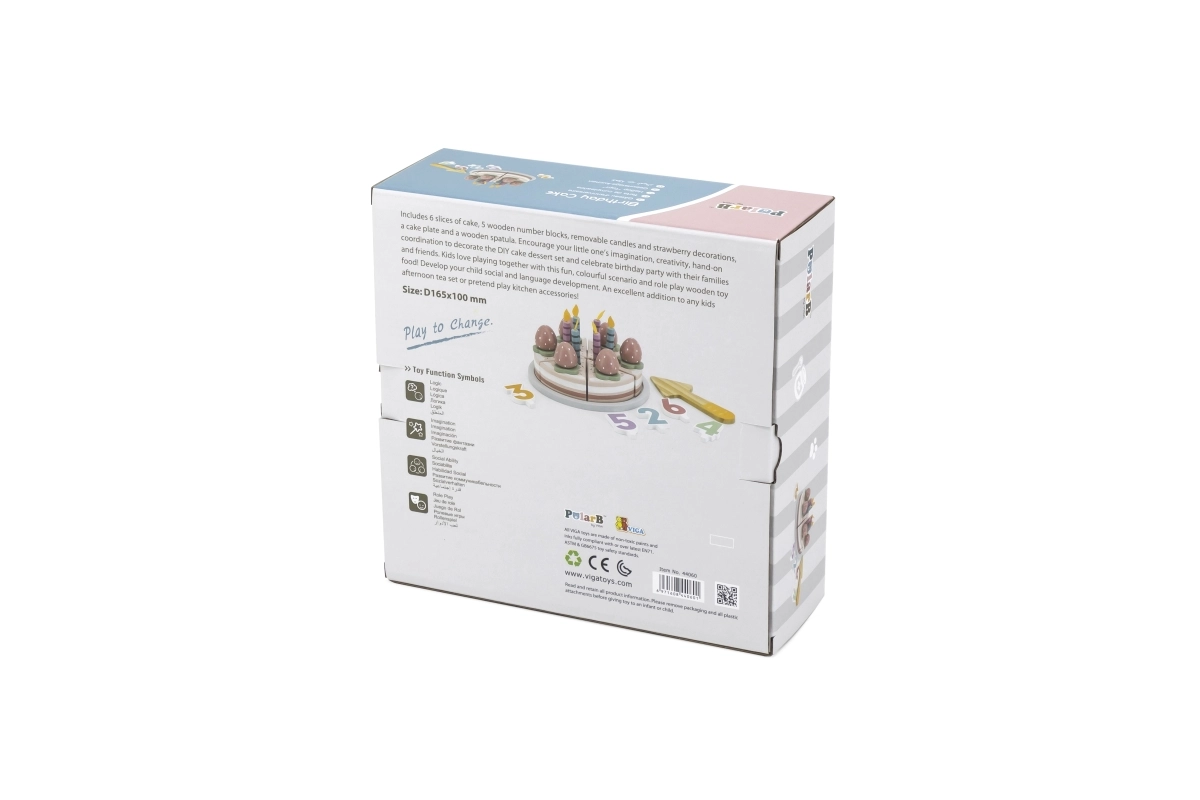 Μια χαριτωμένη ξύλινη τούρτα για κόψιμο από τη μάρκα VIGA της συλλογής POLARB προσφέρει ώρες δημιουργικού παιχνιδιού και μάθησης μέσα από το παιχνίδι. Αποτελείται από 6 κομμάτια τούρτας, αποσπώμενα κεράκια, φραουλίτσες, πιάτο, ξύλινη σπάτουλα και κυβάκια με αριθμούς για πρώτες ασκήσεις μέτρησης. Κατασκευασμένη από ποιοτικό ξύλο και βαμμένη με μη τοξικά χρώματα – μια ασφαλής επιλογή για μικρούς σεφ.