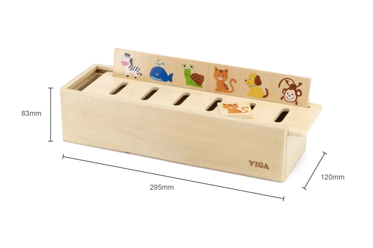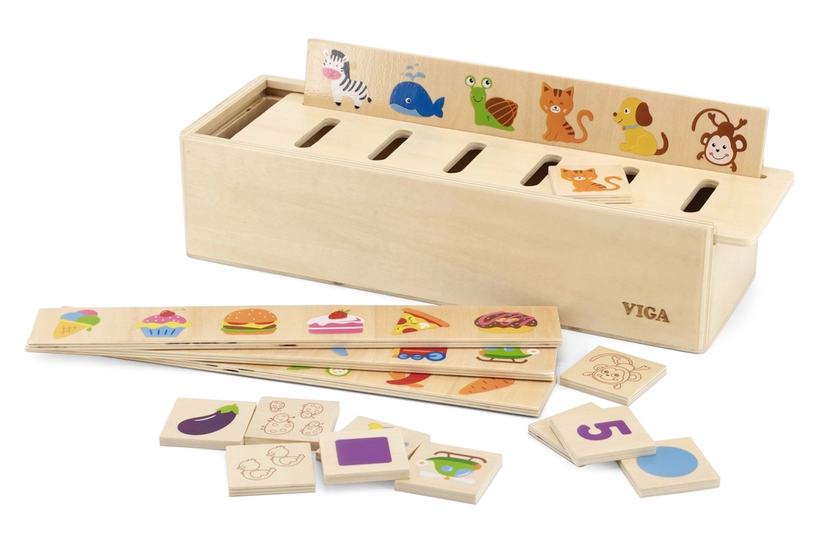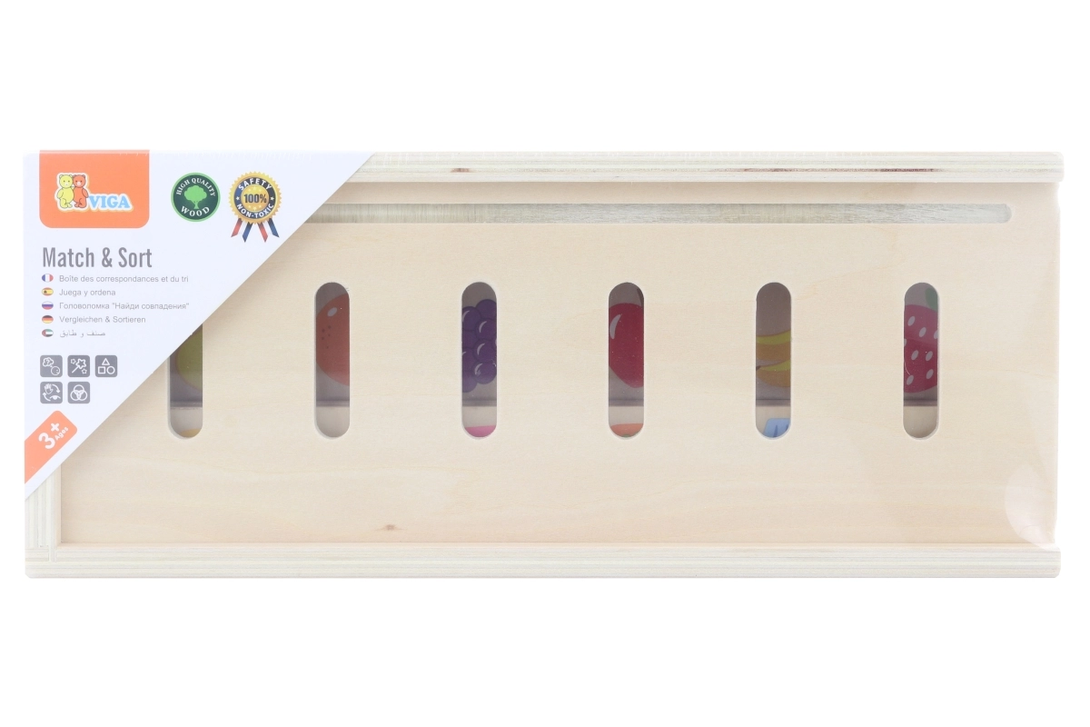 Ο ξύλινος ταξινομητής VIGA είναι ένα προσεγμένο εκπαιδευτικό βοήθημα σε στυλ Montessori. Στο επάνω μέρος του κουτιού τοποθετείται μία από τις μακριές σανίδες με θέματα και το παιδί εισάγει τα ξύλινα κομμάτια στις σωστές οπές σύμφωνα με τις εικόνες και τις κατηγορίες. Το παιχνίδι αναπτύσσει την οπτική αντίληψη, τη λεπτή κινητικότητα και τη συγκέντρωση, ενώ παράλληλα μαθαίνει στα παιδιά να αναγνωρίζουν φρούτα, λαχανικά, ζώα, σχήματα, μέσα μεταφοράς και αριθμούς.