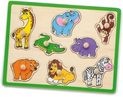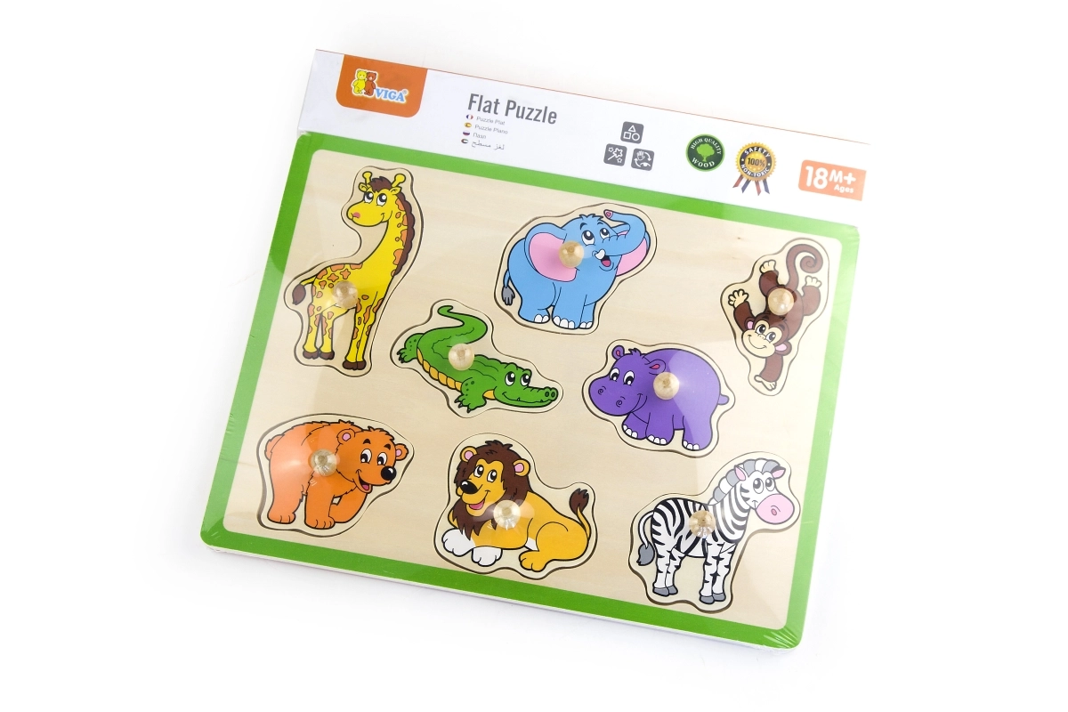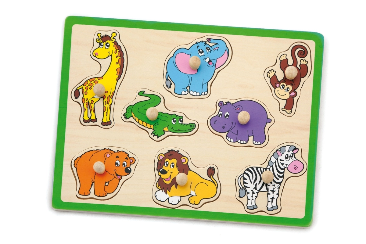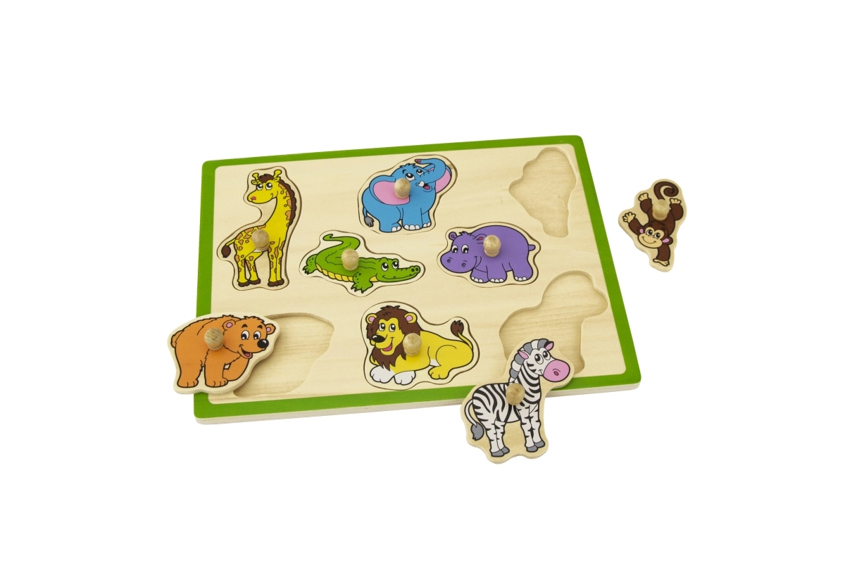 Αυτό το ποιοτικό ξύλινο παζλ-σφηνοειδές με θέμα τη ζούγκλα προσφέρει στα παιδιά χαρά ανακάλυψης ζώων όπως καμηλοπάρδαλη, ελέφαντας, κροκόδειλος, λιοντάρι και ζέβρα. Κάθε κομμάτι διαθέτει πρακτικό ξύλινο χερούλι για εύκολο πιάσιμο και ακριβή τοποθέτηση στο αντίστοιχο σχήμα. Η ανθεκτική βάση με έντονο πράσινο περίγραμμα είναι στιβαρή και στέκεται καλά σε τραπέζι ή επιφάνεια παιχνιδιού.