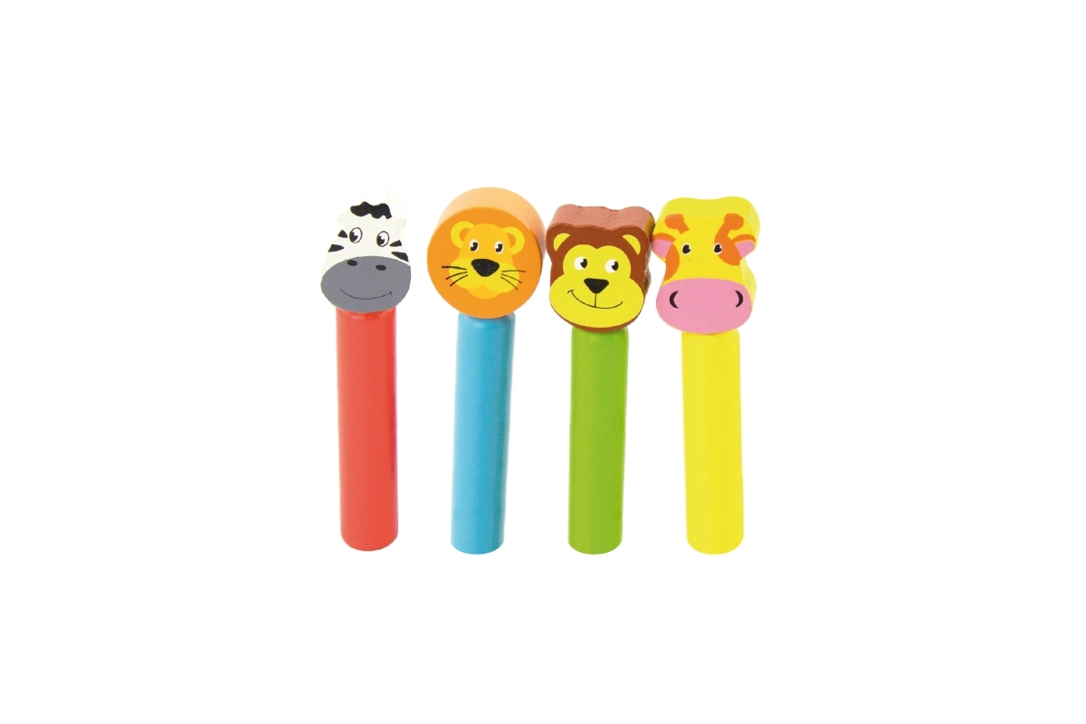 Η σταθερή ξύλινη βάση σε σχήμα καραβιού και τα τέσσερα ξύλινα καλαμάκια με ζωάκια (καμηλοπάρδαλη, μαϊμού, λιοντάρι, ζέβρα) δημιουργούν ένα ασφαλές και ανθεκτικό περιβάλλον παιχνιδιού. Η καλαίσθητη συσκευασία ταιριάζει ως ιδανικό δώρο για προσχολικά παιδιά και νήπια.