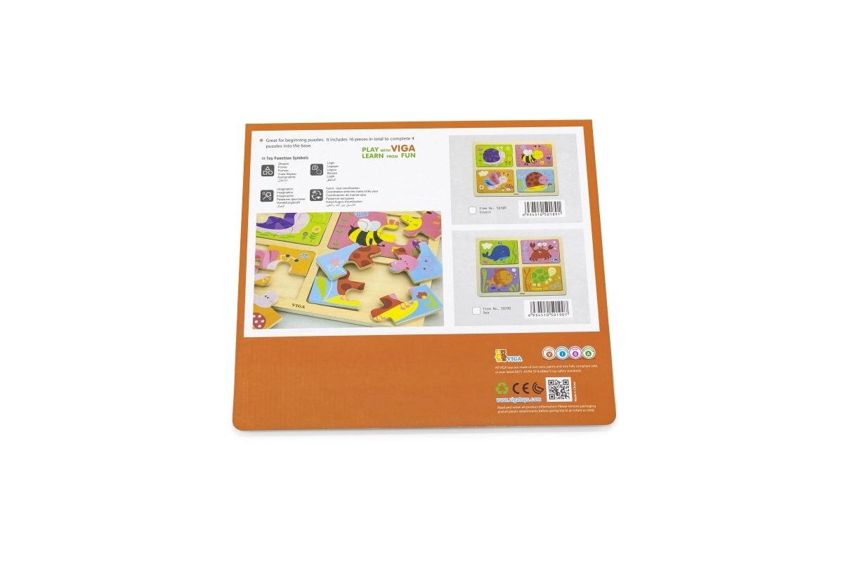 Κάθε παζλ έχει το δικό του υπόβαθρο-πλαίσιο, γεγονός που διευκολύνει τον προσανατολισμό και βοηθά τα παιδιά να πετύχουν πιο γρήγορα. Τα στιβαρά ξύλινα κομμάτια είναι ευχάριστα στην αφή, κρατιούνται εύκολα και αντέχουν στη συχνή χρήση.