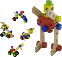 Αυτό το ξύλινο σετ κατασκευών τύπου κονστράκτορας είναι ιδανική επιλογή για τις πρώτες τεχνικές κατασκευές. Τα παιδιά μπορούν να δημιουργήσουν δικές τους ιδέες ή να εμπνευστούν από το συνοδευτικό φυλλάδιο με εικονικές οδηγίες. Ο συμπαγής κουβάς με χερούλι διευκολύνει τη μεταφορά και την αποθήκευση, ώστε το σετ να είναι πάντα πρόχειρο και τα κομμάτια να μην χάνονται.