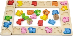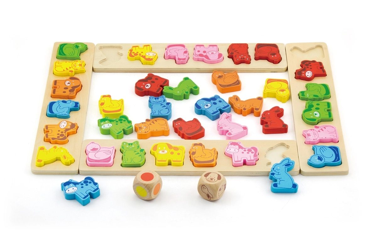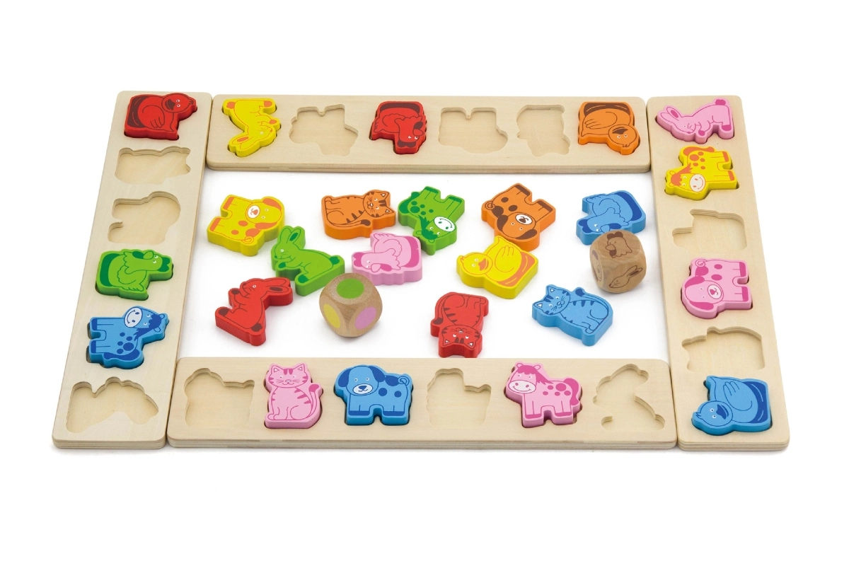 - Περιεχόμενα συσκευασίας: 4 πίνακες-πρότυπα, 36 σχήματα ζώων, 1 ζάρι με ζώα, 1 χρωματιστό ζάρι