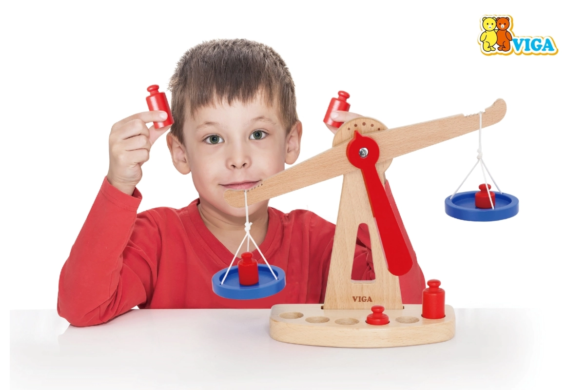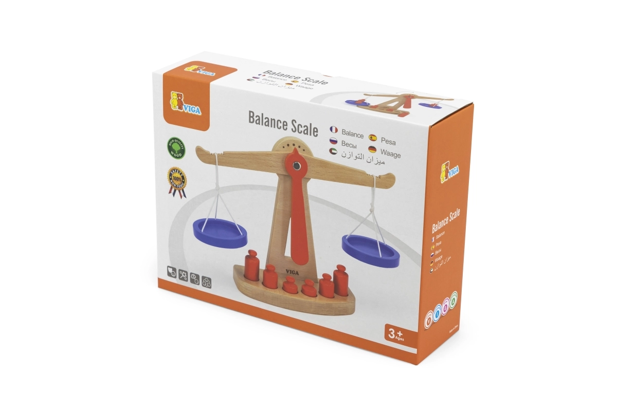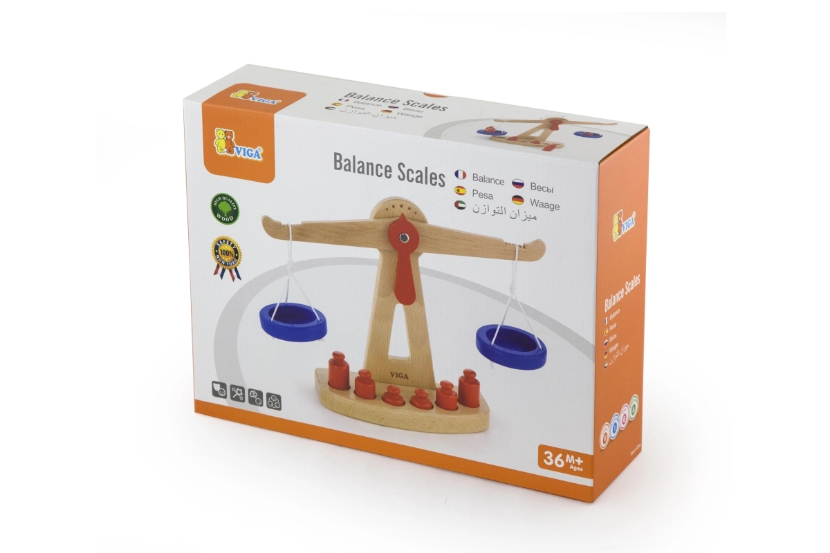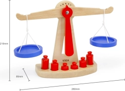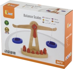 Η ξύλινη ζυγαριά ισορροπίας της Viga είναι εξοπλισμένη με δύο μπλε δίσκους κρεμασμένους σε κορδόνια και περιλαμβάνει έξι κόκκινα βαρίδια διαφορετικών μεγεθών. Χάρη στον χρωματιστό σχεδιασμό και τη ασφαλή επιφάνεια, αυτή η ζυγαριά προσφέρει στα παιδιά πολλή διασκέδαση. Έχει σχεδιαστεί ώστε να ενθαρρύνει τα παιδιά να χρησιμοποιούν τη φαντασία τους στο παιχνίδι ρόλων (π.χ. κατάστημα), βοηθώντας τα να κατανοήσουν βασικές μαθηματικές έννοιες και τη σημασία της ισορροπίας.