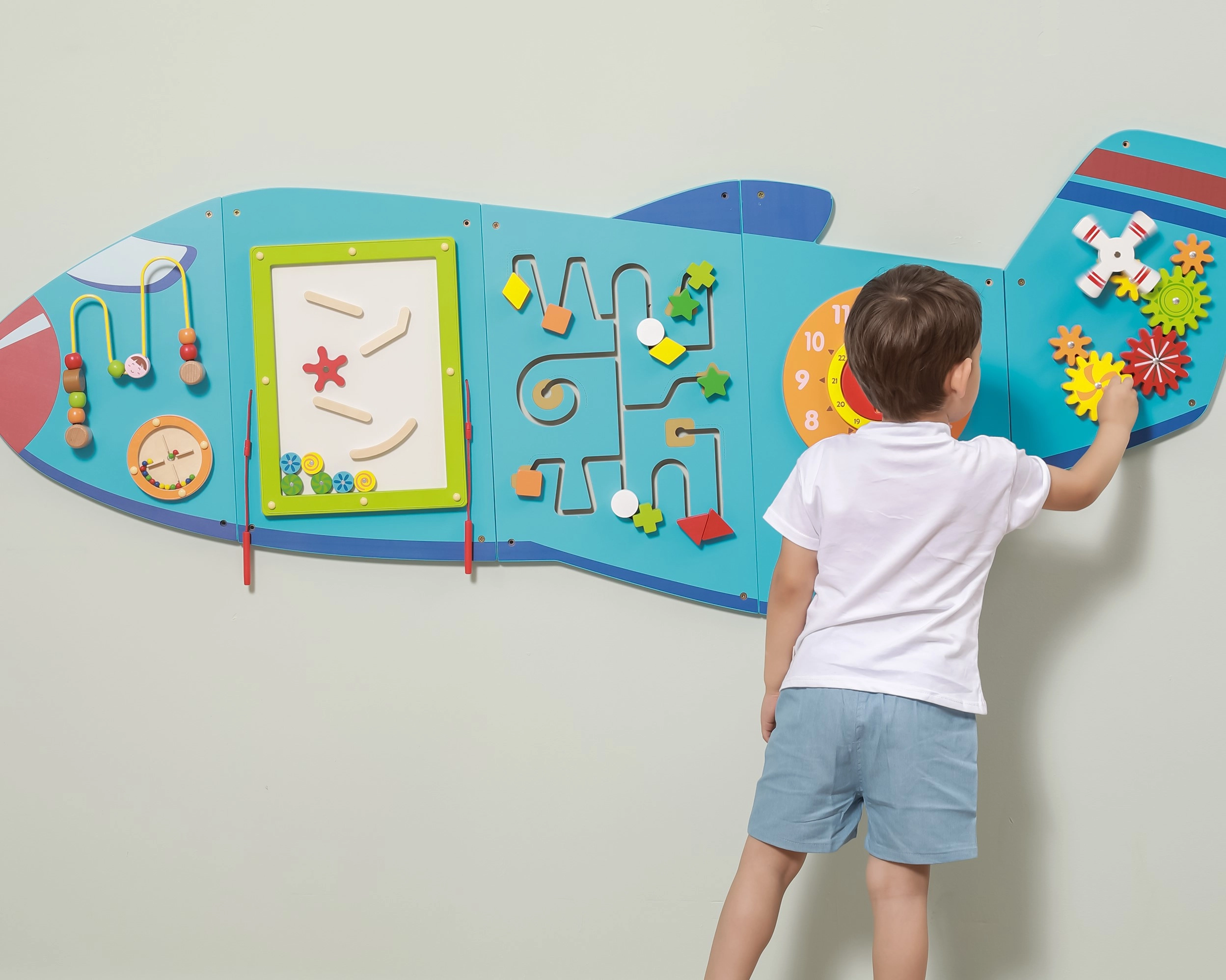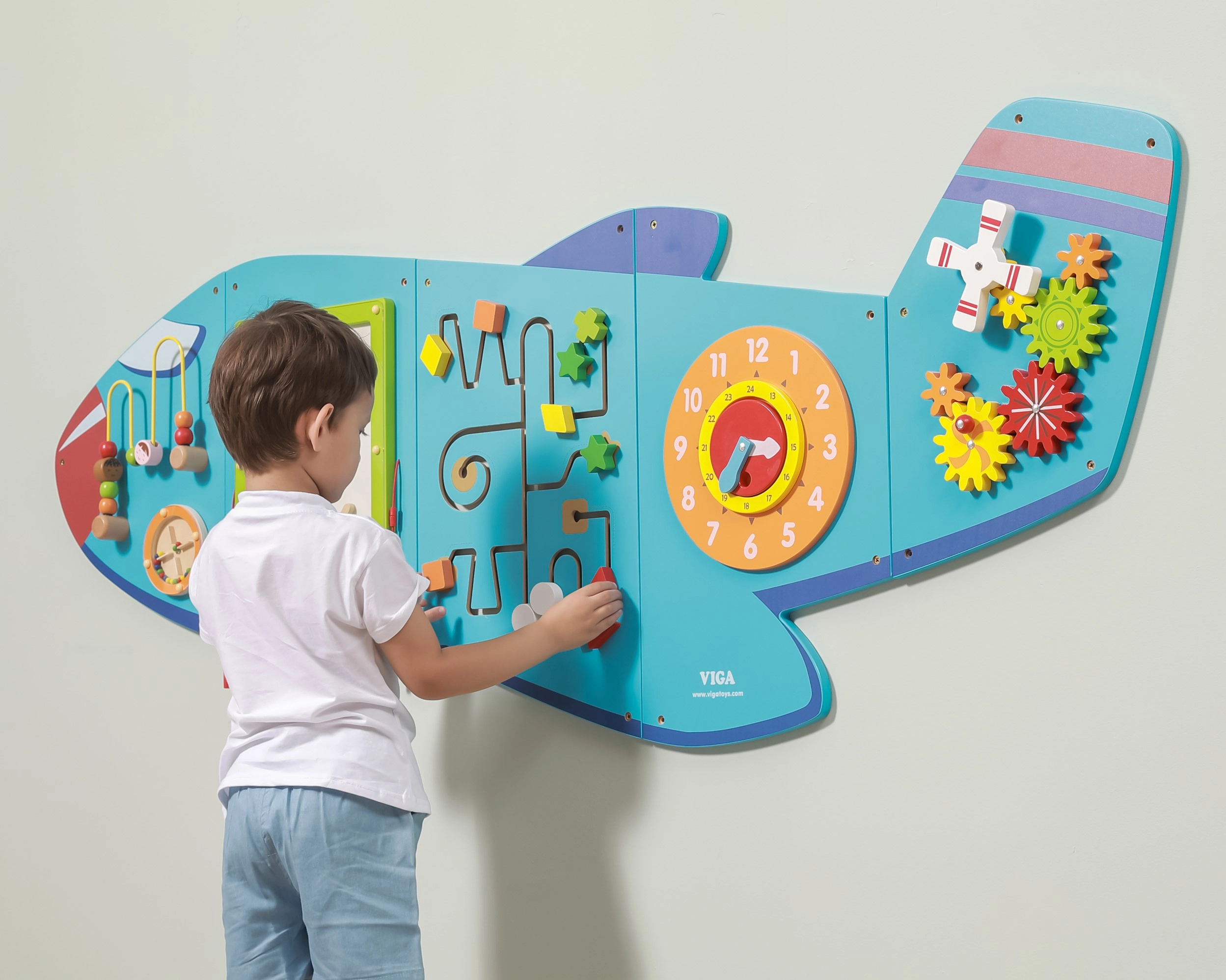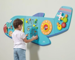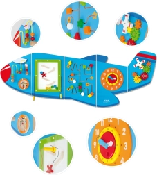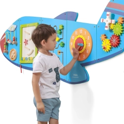Ο ξύλινος επιτοίχιος πίνακας Αεροπλάνο της VIGA είναι ένα πολυλειτουργικό παιχνίδι που αποτελείται από πέντε μέρη, τα οποία μαζί σχηματίζουν το σχήμα αεροπλάνου. Κάθε στοιχείο προσφέρει διαφορετικό είδος δραστηριότητας για ευχάριστη ανάπτυξη των δεξιοτήτων των παιδιών: