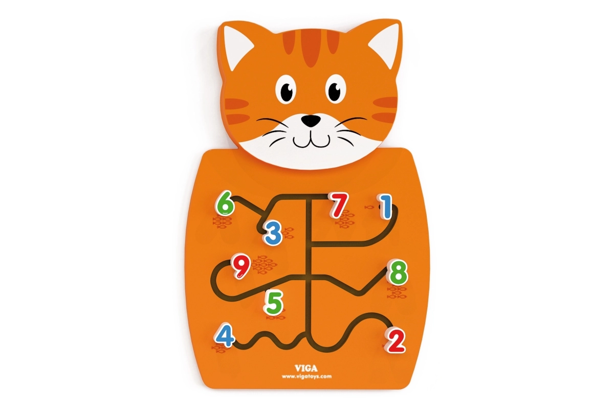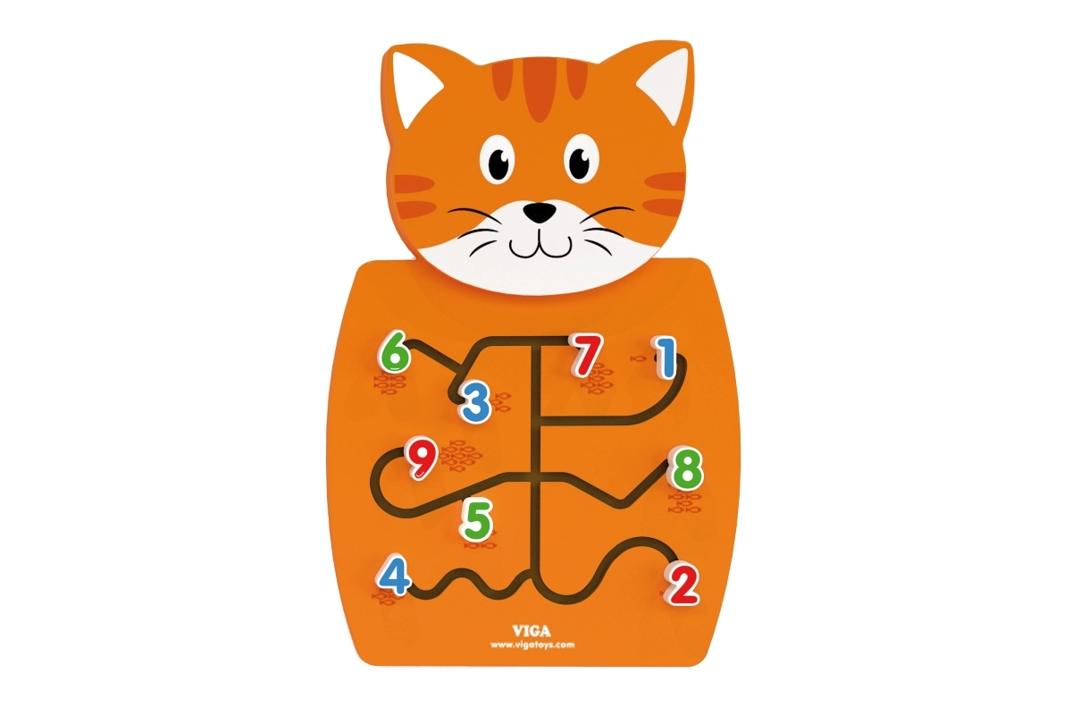 Αυτό το διαδραστικό παιχνίδι σε σχήμα γάτας διαθέτει διαφορετικά κομμένους λαβύρινθους στην κοιλιά, όπου τα παιδιά πρέπει να μετακινούν τουβλάκια με αριθμούς και να τα αντιστοιχούν με τον αντίστοιχο αριθμό από τα εμφανιζόμενα ψαράκια. Έτσι, τα παιδιά μαθαίνουν τις βασικές αρχές των μαθηματικών και της λογικής σκέψης. Σύμφωνα με τις αρχές Montessori, το παιχνίδι ενθαρρύνει τα παιδιά να επιλύουν μόνα τους προβλήματα μέσω του παιχνιδιού.