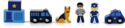 Τα παιδιά σας μπορούν να δημιουργούν τις δικές τους ιστορίες και σενάρια με αυτές τις πολύχρωμες φιγούρες, που αποδίδουν αυθεντική ατμόσφαιρα αστυνομικής σκηνής: από τον αστυνομικό μέχρι τον ληστή και τον αστυνομικό σκύλο. Όλες οι φιγούρες είναι φτιαγμένες από ποιοτικό ξύλο, γεγονός που εγγυάται αντοχή και μεγάλη διάρκεια ζωής.