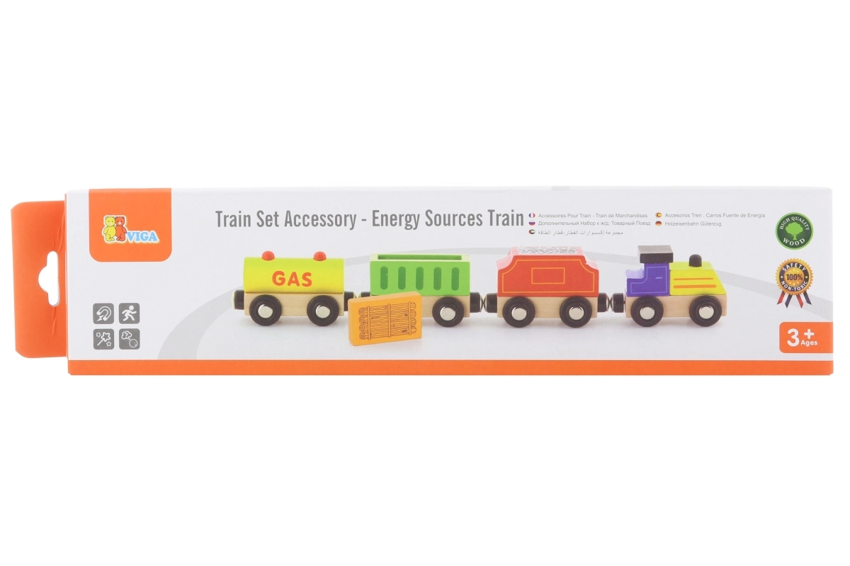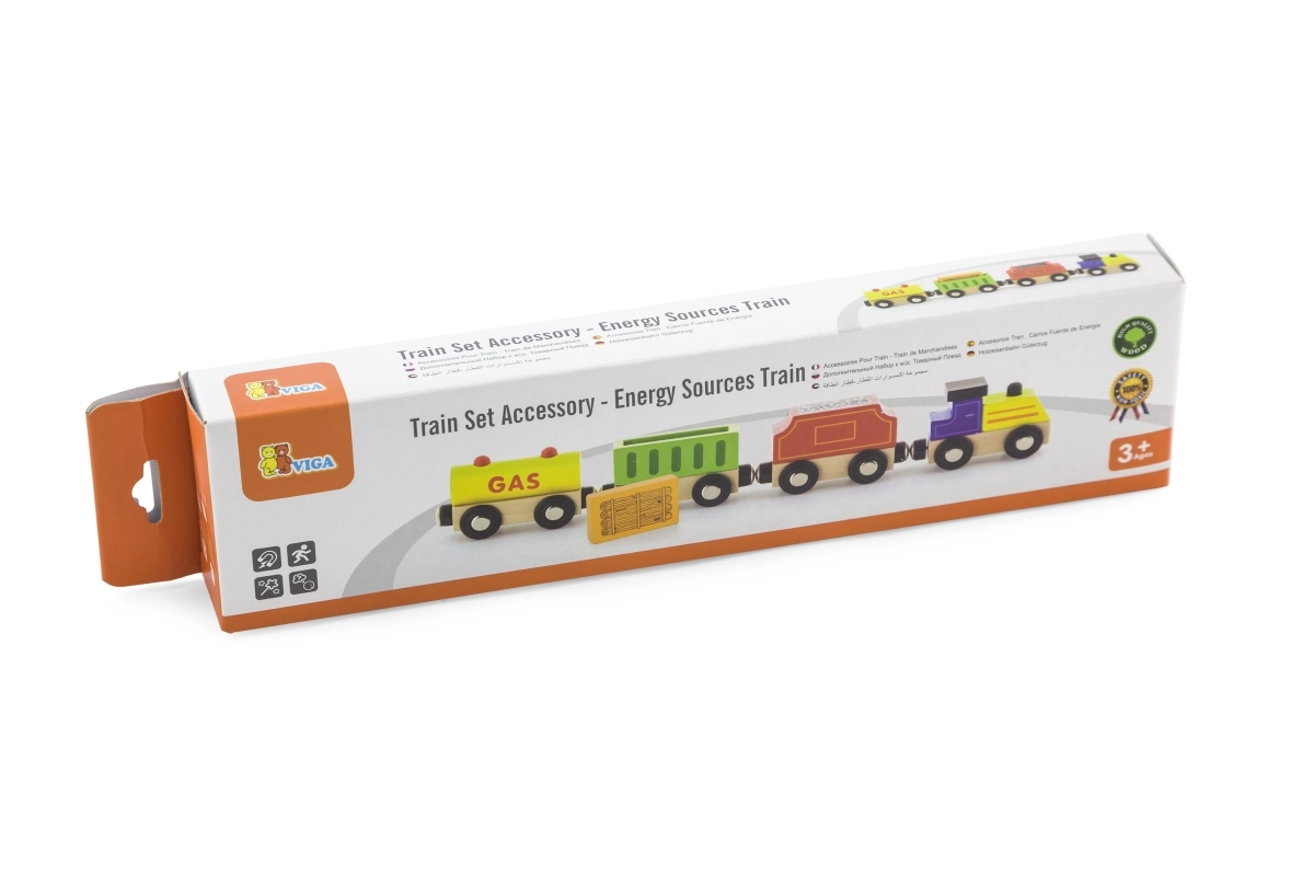 Το τρενάκι VIGA με θέμα τις πηγές ενέργειας προσφέρει πολλή διασκέδαση και μάθηση. Το σετ περιλαμβάνει μηχανή και τρία διαφορετικά βαγόνια (π.χ. βυτιοφόρο, φορτηγό και βαγόνι άνθρακα), τα οποία τα παιδιά συνδέουν εύκολα με μαγνήτες. Η ποιοτική ξύλινη κατασκευή και ο πολύχρωμος σχεδιασμός προσκαλούν στο παιχνίδι και αναπτύσσουν τη φαντασία.