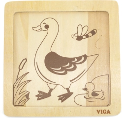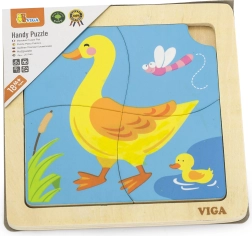 Το ξύλινο παζλ Viga περιλαμβάνει τέσσερα θεματικά κομμάτια που τοποθετούνται εύκολα σε σανίδα με εικόνα. Κάθε κομμάτι είναι κατασκευασμένο από ποιοτικό ξύλο και βαμμένο με ασφαλή, μη τοξικά χρώματα, που διασφαλίζουν την ασφάλεια των παιδιών και του περιβάλλοντος.