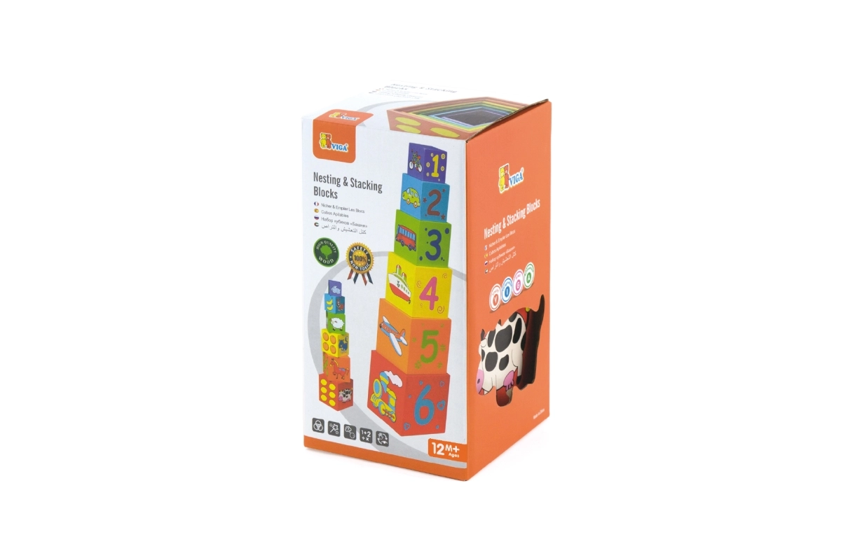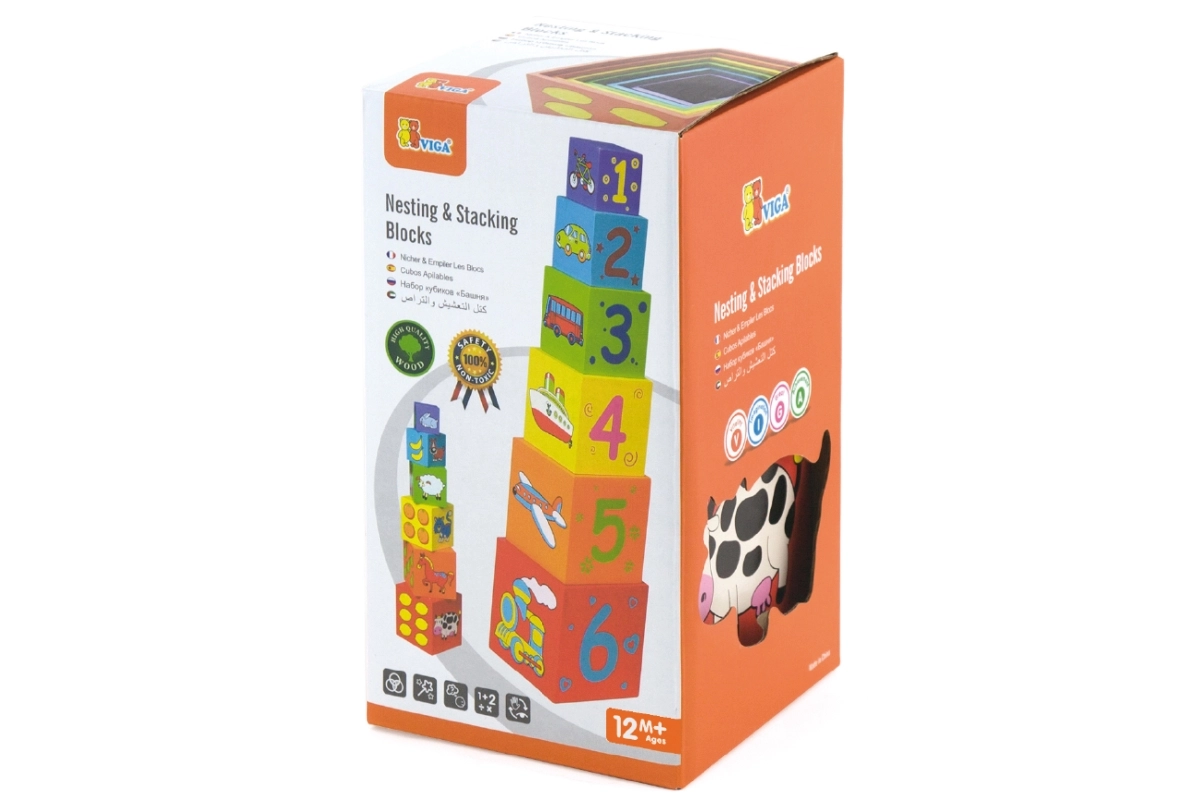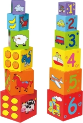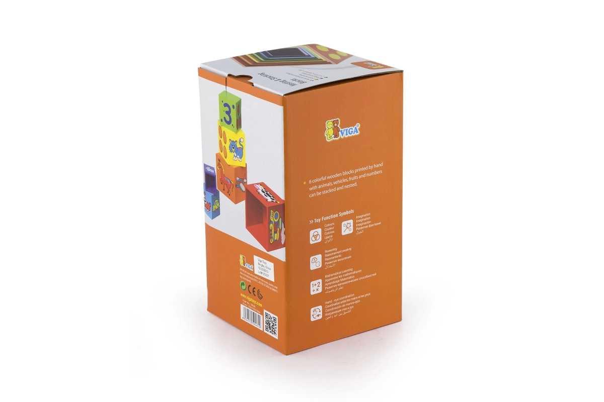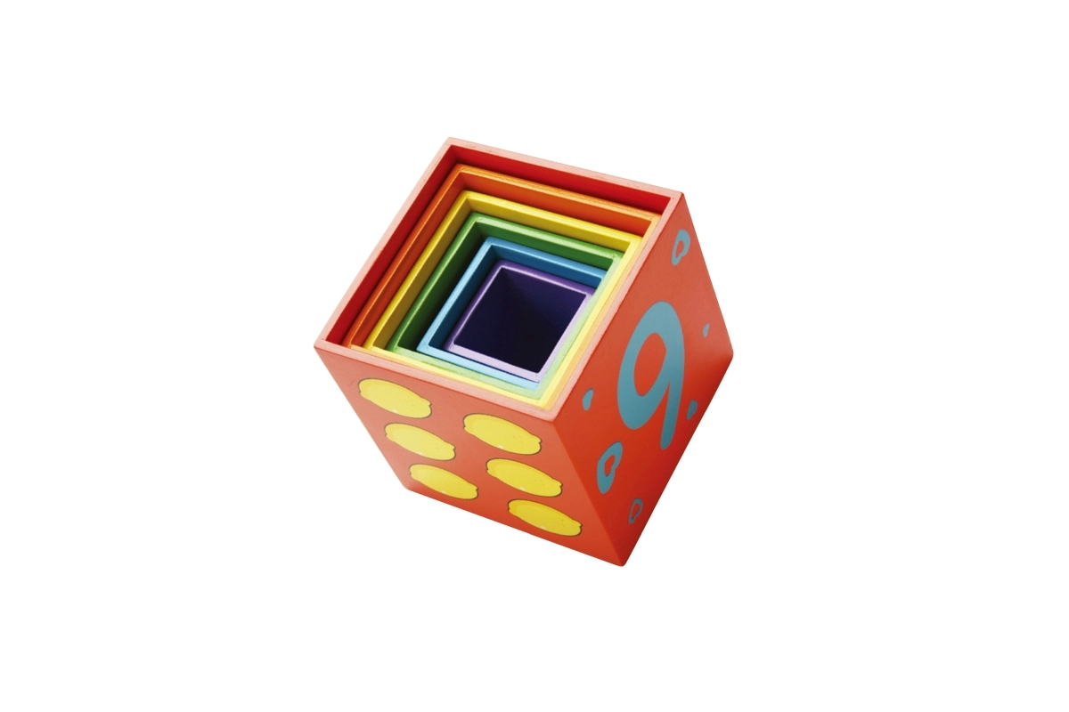 Κάθε πλευρά του τουβλακιού είναι διακοσμημένη με διαφορετικά μοτίβα, όπως ζωάκια, αριθμοί, φρούτα και μέσα μεταφοράς, που εμπλουτίζουν τη φαντασία των παιδιών.