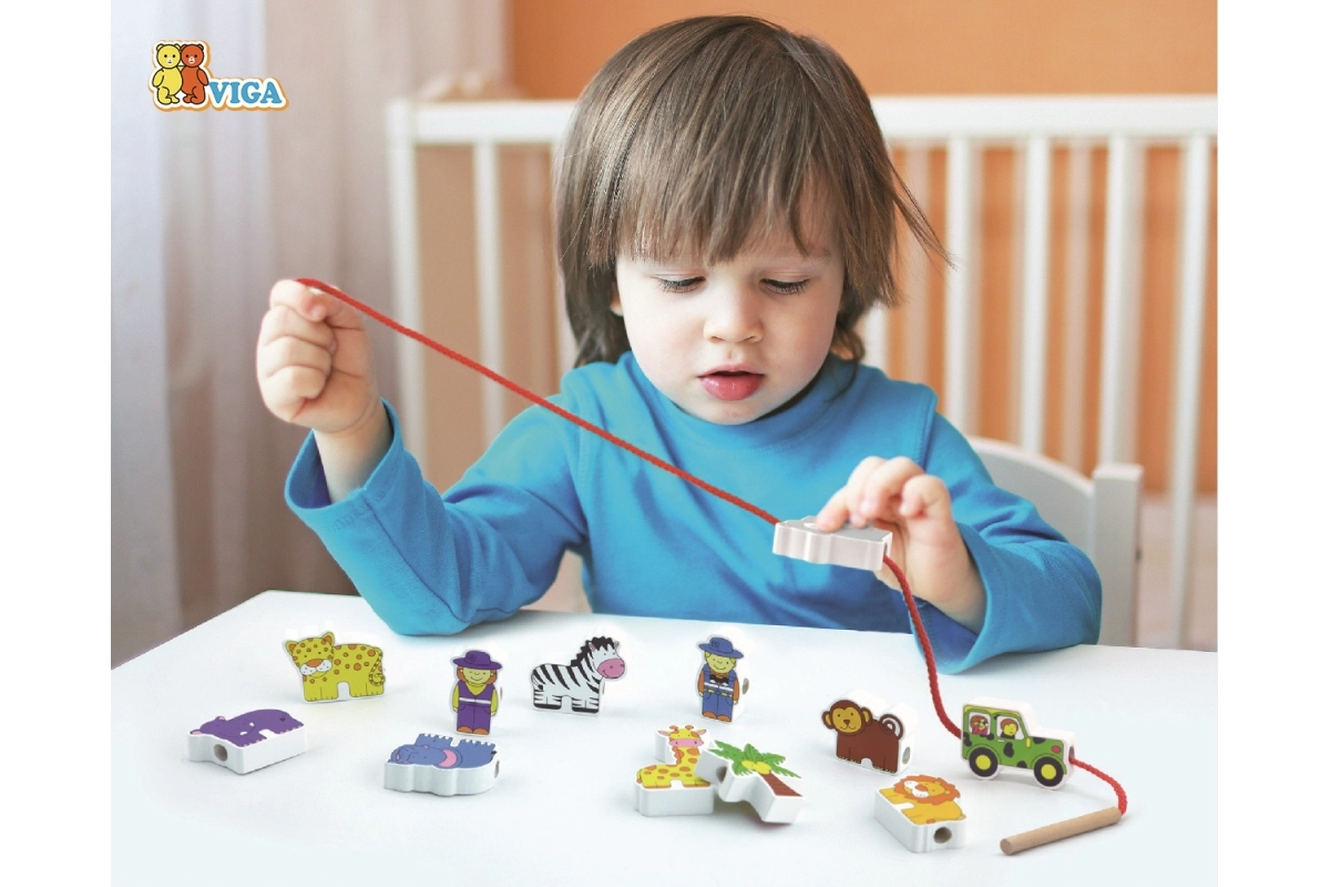 Το σετ περιλαμβάνει πολύχρωμα ξύλινα μπλοκ και κορδόνι, που μαθαίνουν στα παιδιά επιδεξιότητα και υπομονή μέσω του περάσματος.