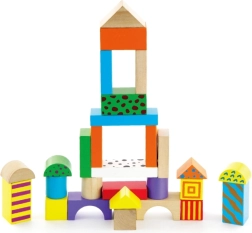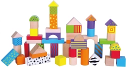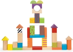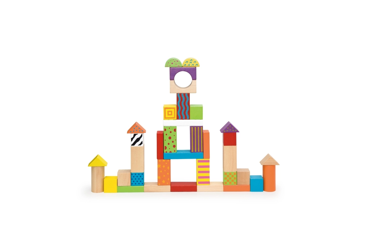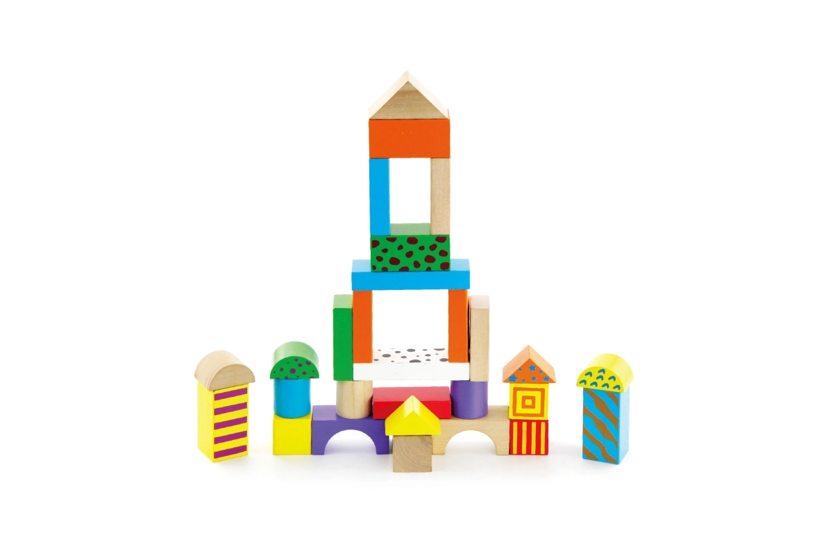 Ποικιλία σχημάτων – κύβοι, κύλινδροι, καμάρες και σκεπές – που ενθαρρύνουν τη φαντασία και υποστηρίζουν τη λεπτή κινητικότητα και τη χωρική αντίληψη.