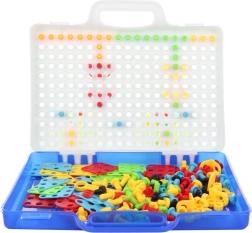 Όλα τοποθετούνται στη φορητή βαλίτσα με καπάκι που λειτουργεί ως pegboard, ώστε το σετ να μεταφέρεται και να τακτοποιείται εύκολα. Εξαιρετικό βοήθημα για την ανάπτυξη της κινητικότητας, του συντονισμού χεριού–ματιού, της δημιουργικότητας και της υπομονής.
