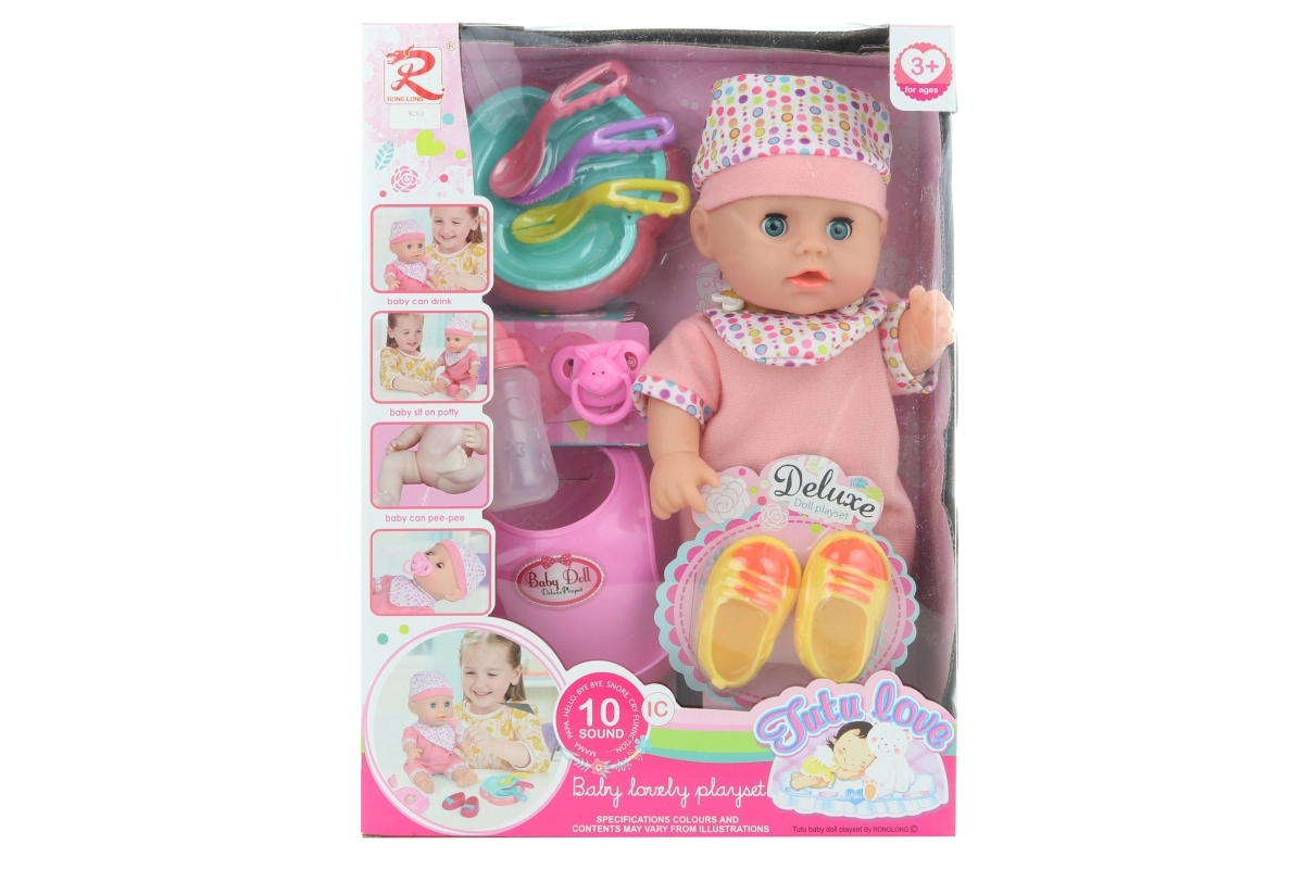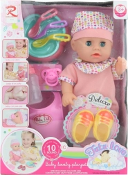 Χαριτωμένη κούκλα για παιδιά από 3 ετών, η οποία με την τοποθέτηση μπαταριών παράγει ρεαλιστικούς ήχους και μπορεί να κατουρά. Περιλαμβάνει πλούσια αξεσουάρ όπως παπουτσάκια, πλαστική σαλιάρα, μπιμπερό και πιατάκι. Ιδανική για εξάσκηση στη φροντίδα μωρού και ανάπτυξη της φαντασίας.