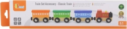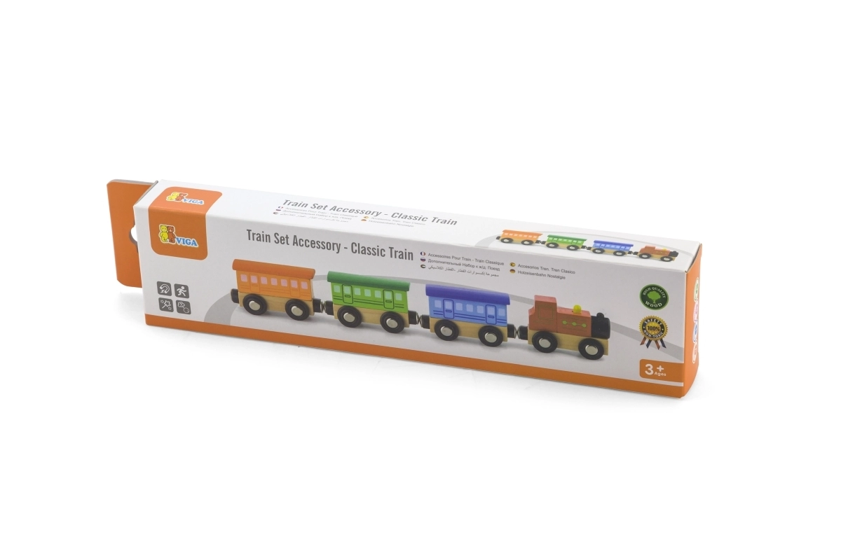 Το ξύλινο σετ Κλασικό τρενάκι περιλαμβάνει 4 μέρη που συνδέονται με μαγνήτες. Αυτό το παιχνίδι έχει σχεδιαστεί από τον καταξιωμένο κατασκευαστή ξύλινων παιχνιδιών, τη Viga Toys. Το σετ μπορεί να χρησιμοποιηθεί ως αυτόνομο παιχνίδι ή ως συμπλήρωμα σε άλλες σιδηροδρομικές πίστες, κατασκευές και σετ.