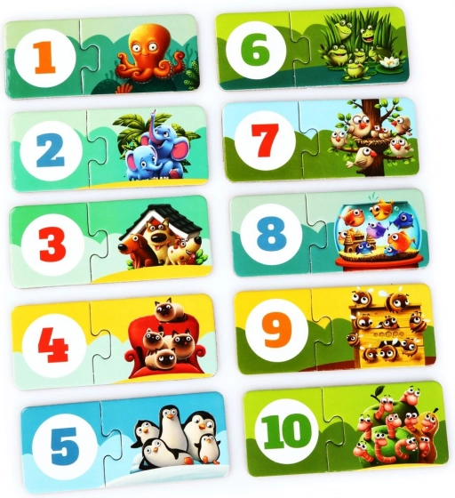 Διασκεδαστικό εκπαιδευτικό σετ για τους μικρούς: 20 στιβαρά κομμάτια σχηματίζουν 10 ζευγάρια, τα οποία τα παιδιά ταιριάζουν σύμφωνα με τον αριθμό των ζώων και τα ψηφία 1–10. Το παιχνίδι ενισχύει τη λογική σκέψη, τη λεπτή κινητικότητα και την αναγνώριση αριθμών, είναι φτιαγμένο από ανθεκτικό πολυστρωματικό χαρτόνι και συντηρείται εύκολα με σκούπισμα με ένα υγρό πανί.