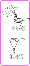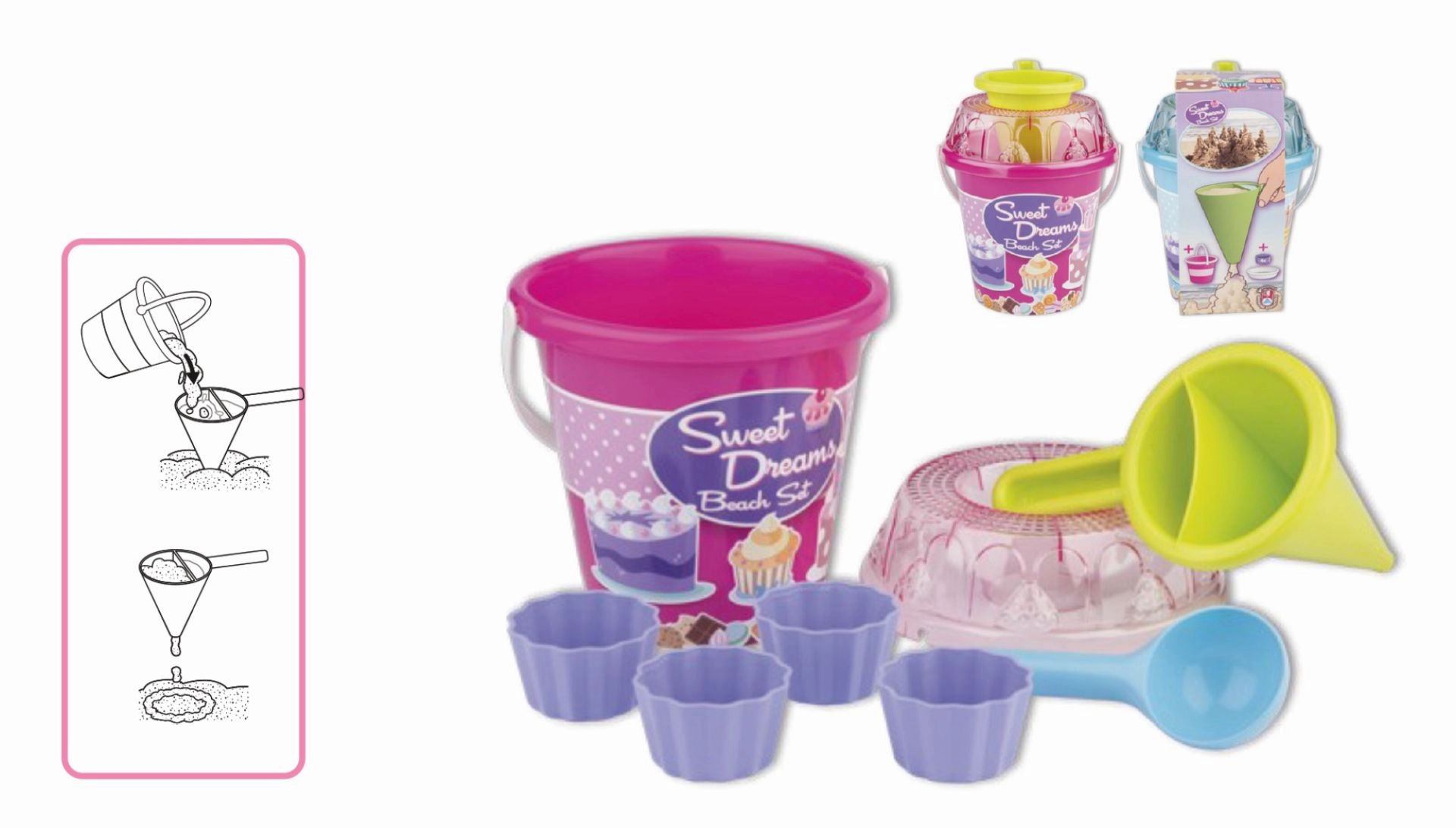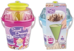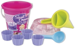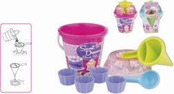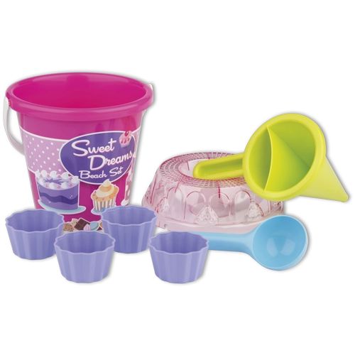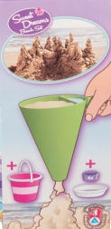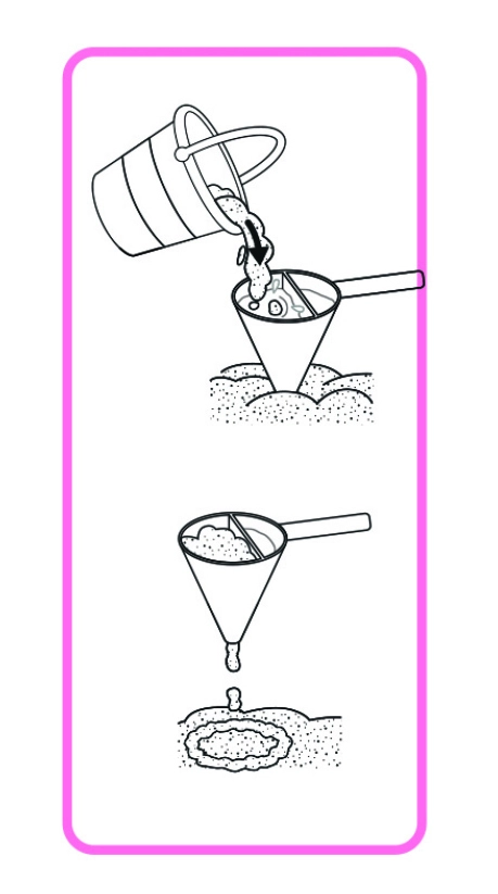 - Εξοπλισμός 8 τεμαχίων: κουβαδάκι, κόσκινο, φτυαράκι, 4 καλουπάκια, διακοσμητικό χωνί