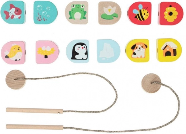 Τα παιδιά, περνώντας τα κομμάτια στο κορδόνι, συνδέουν τα ζωάκια με το περιβάλλον όπου ζουν και αναπτύσσουν τη λογική σκέψη και το λεξιλόγιό τους. Ιδανικό για παιχνιδιάρικη μάθηση κάθε μέρα.