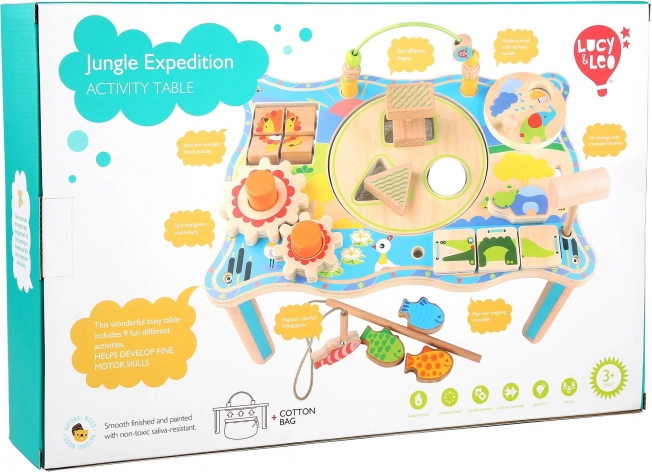 Ανακαλύψτε διασκέδαση και μάθηση μαζί με το παιδικό τραπεζάκι LUCY & LEO – Αποστολή στη ζούγκλα. Αυτό το ποιοτικό ξύλινο πολυλειτουργικό τραπεζάκι προσφέρει μια ποικιλία δραστηριοτήτων για την ανάπτυξη των δεξιοτήτων των παιδιών: μαγνητικό ψάρεμα, οδοντωτοί τροχοί, λαβύρινθος με μπίλιες, κοπανητήρι και κουμπώματα σχημάτων. Η στιβαρή κατασκευή, ο παιχνιδιάρικος σχεδιασμός και το πρακτικό λινό πουγκί για τη συλλογή κομματιών εξασφαλίζουν ατελείωτες ώρες δημιουργικού παιχνιδιού.