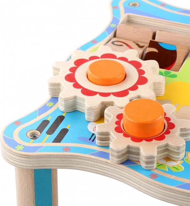 Το ξύλινο τραπεζάκι με μοτίβα ζούγκλας συνδυάζει διασκέδαση και μάθηση και υποστηρίζει τη λεπτή κινητικότητα, τον συντονισμό ματιού–χεριού και τη λογική σκέψη. Τα παιδιά μπορούν να περιστρέφουν τους οδοντωτούς τροχούς, να μετακινούν χάντρες στην τροχιά, να εξασκούν δύναμη και συγκέντρωση με το κοπανητήρι και να καλλιεργούν την αναγνώριση σχημάτων χάρη στην ταξινόμηση σχημάτων. Στο κέντρο υπάρχει λινό πουγκί για τα ψαράκια και τα κομμάτια του παιχνιδιού, ώστε η επιφάνεια να παραμένει τακτοποιημένη.