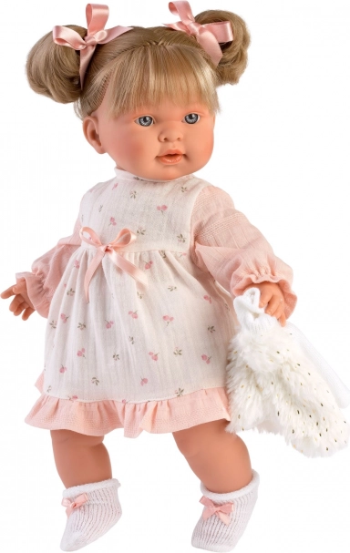 Προσφέρετε στην κούκλα σας μια νέα γκαρνταρόμπα: ροζ φορεματάκι με διακριτικό μοτίβο, συμπληρωμένο από ένα απαλό λευκό γιλεκάκι και άνετο σλιπάκι. Το σετ έχει σχεδιαστεί για κούκλες μεγέθους 42 cm και ξεχωρίζει για τις ταιριαστές λεπτομέρειες και το εύκολο ντύσιμο.